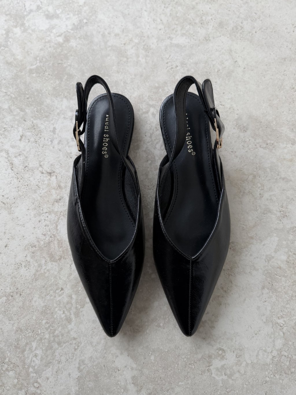 Elegantné baleríny so špicatou špičkou, otvorenou pätou a nastaviteľným remienkom. Nízky stabilný podpätok zabezpečí pohodlie na bežné aj formálnejšie nosenie.