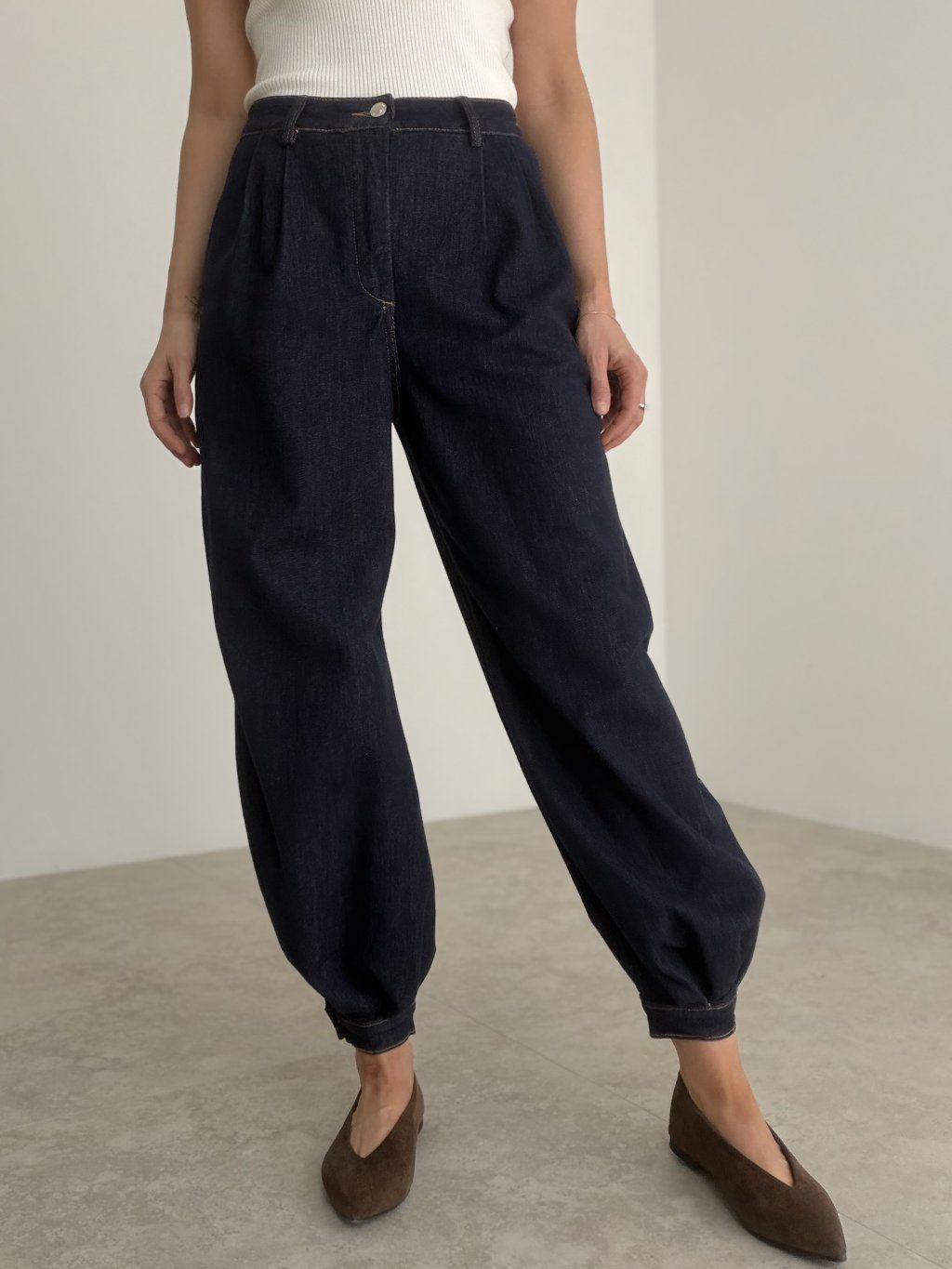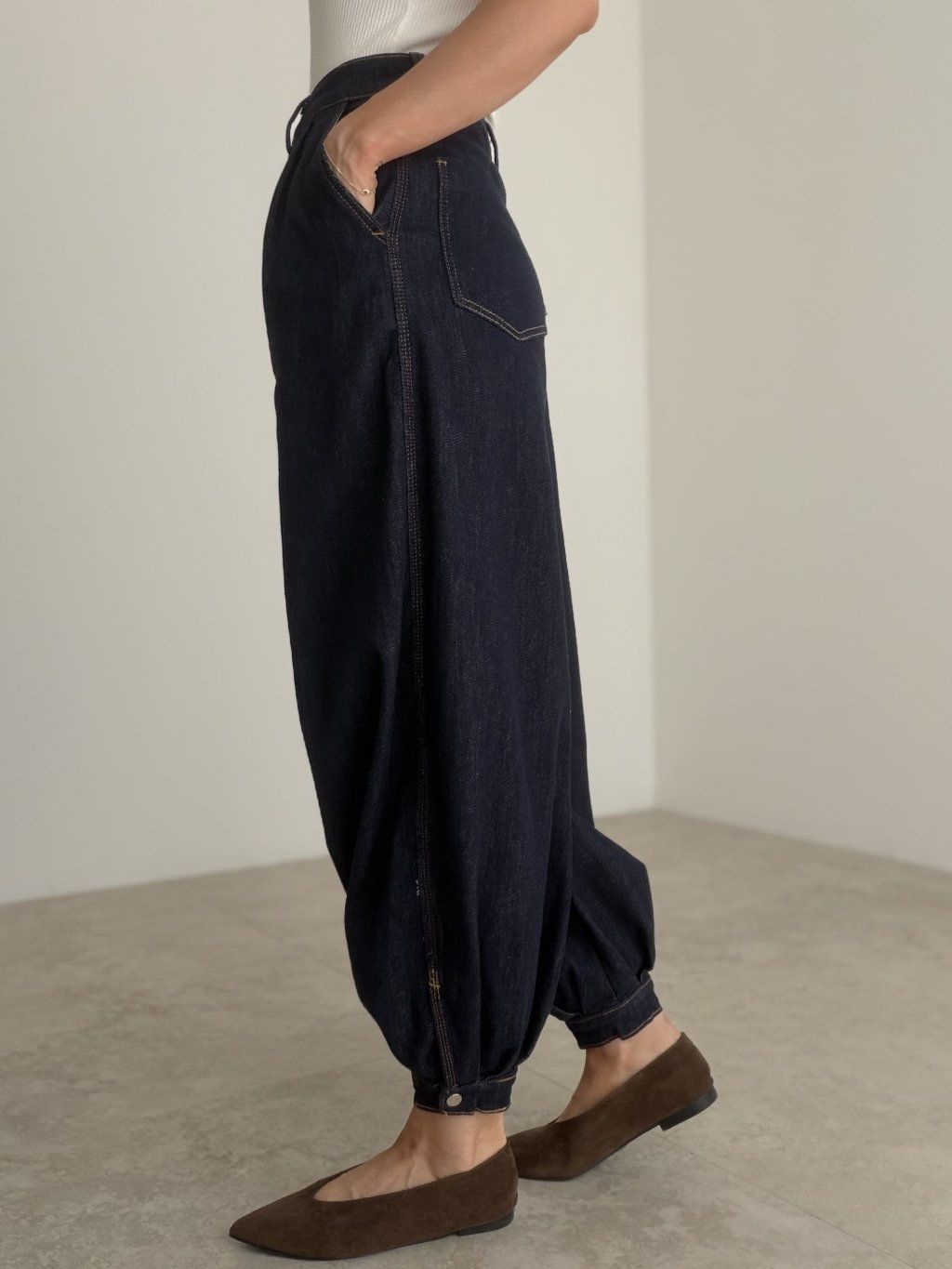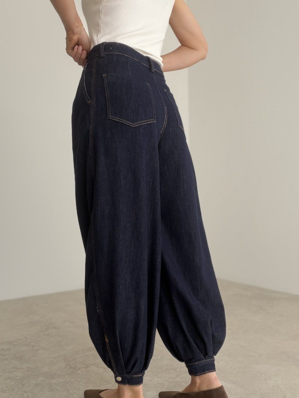 Balónové rifle s vyšším pásom, voľným strihom a zúženým zakončením pri členkoch. Moderný a pohodlný kúsok na každodenné nosenie.