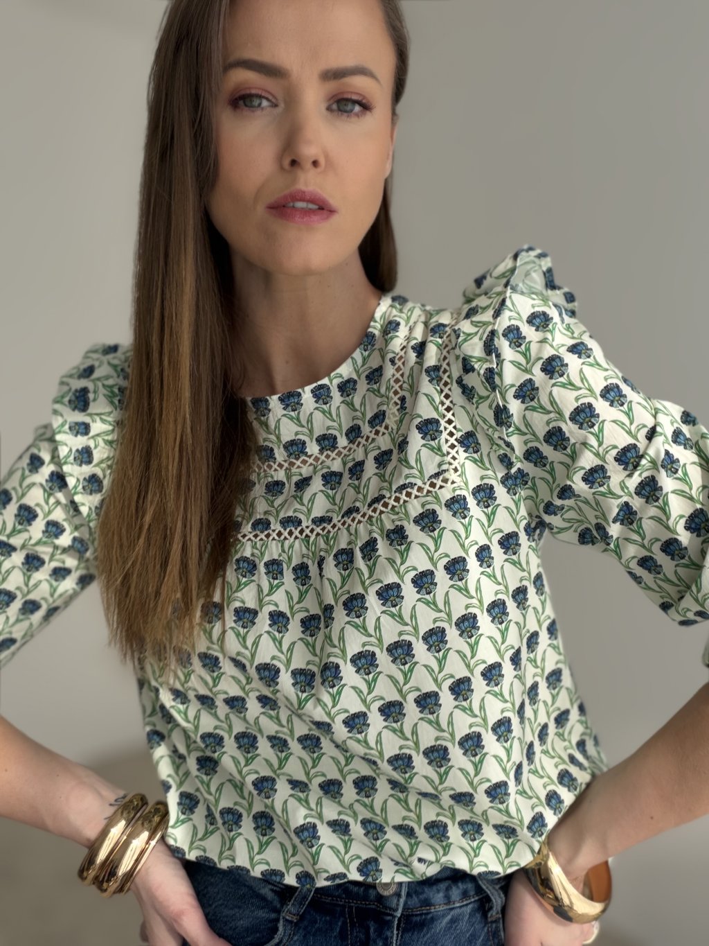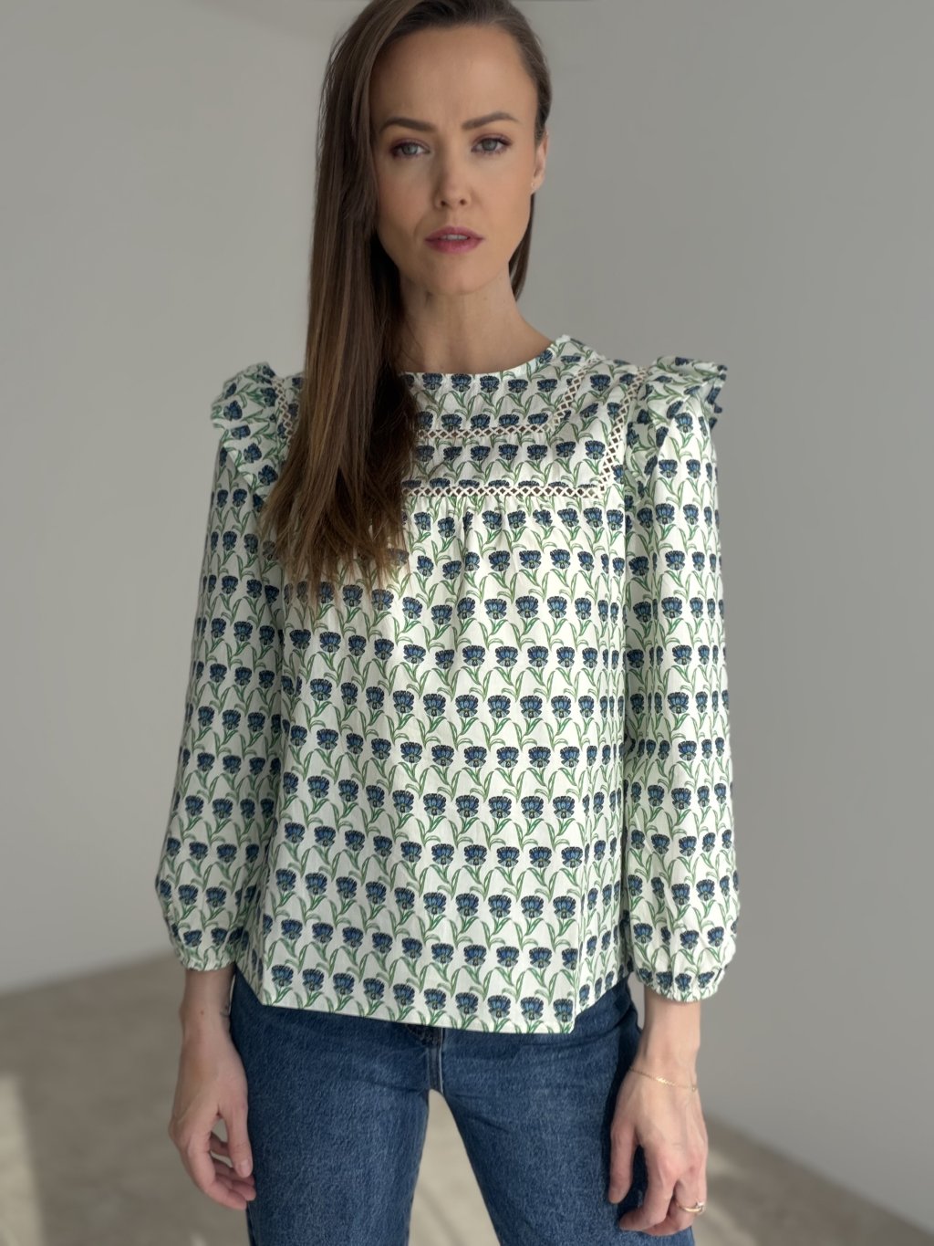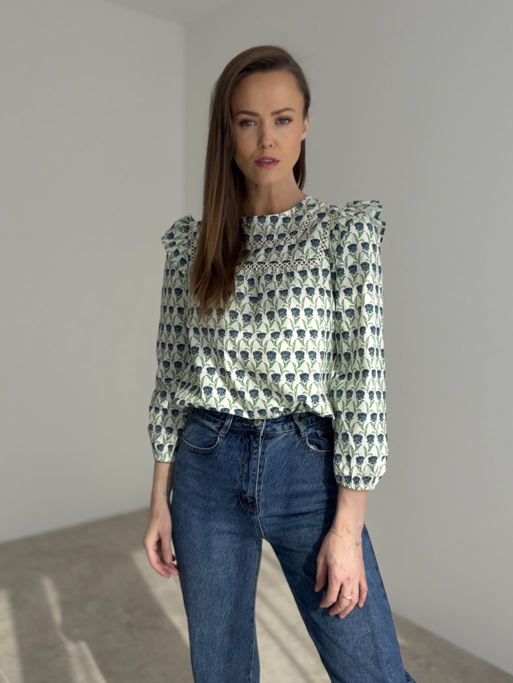 Romantická blúzka s jemným vzorom, dekoratívnym prešívaním a volánovými detailmi na ramenách pôsobí žensky, elegantne a nadčasovo. Je ideálnou voľbou na každodenné nosenie aj štýlové outfitové kombinácie.