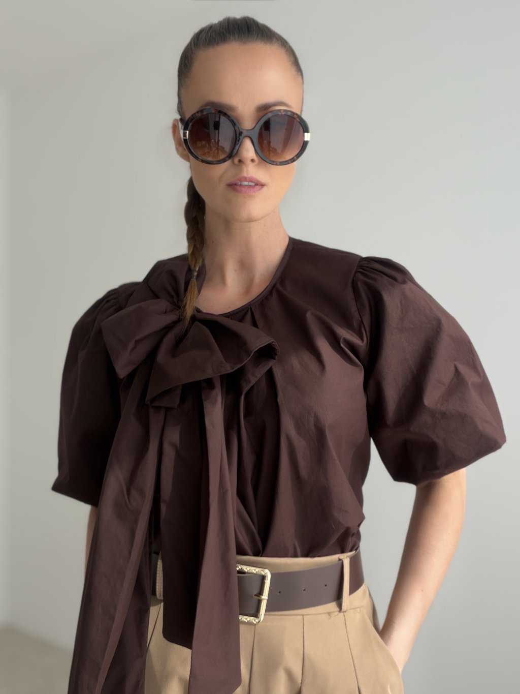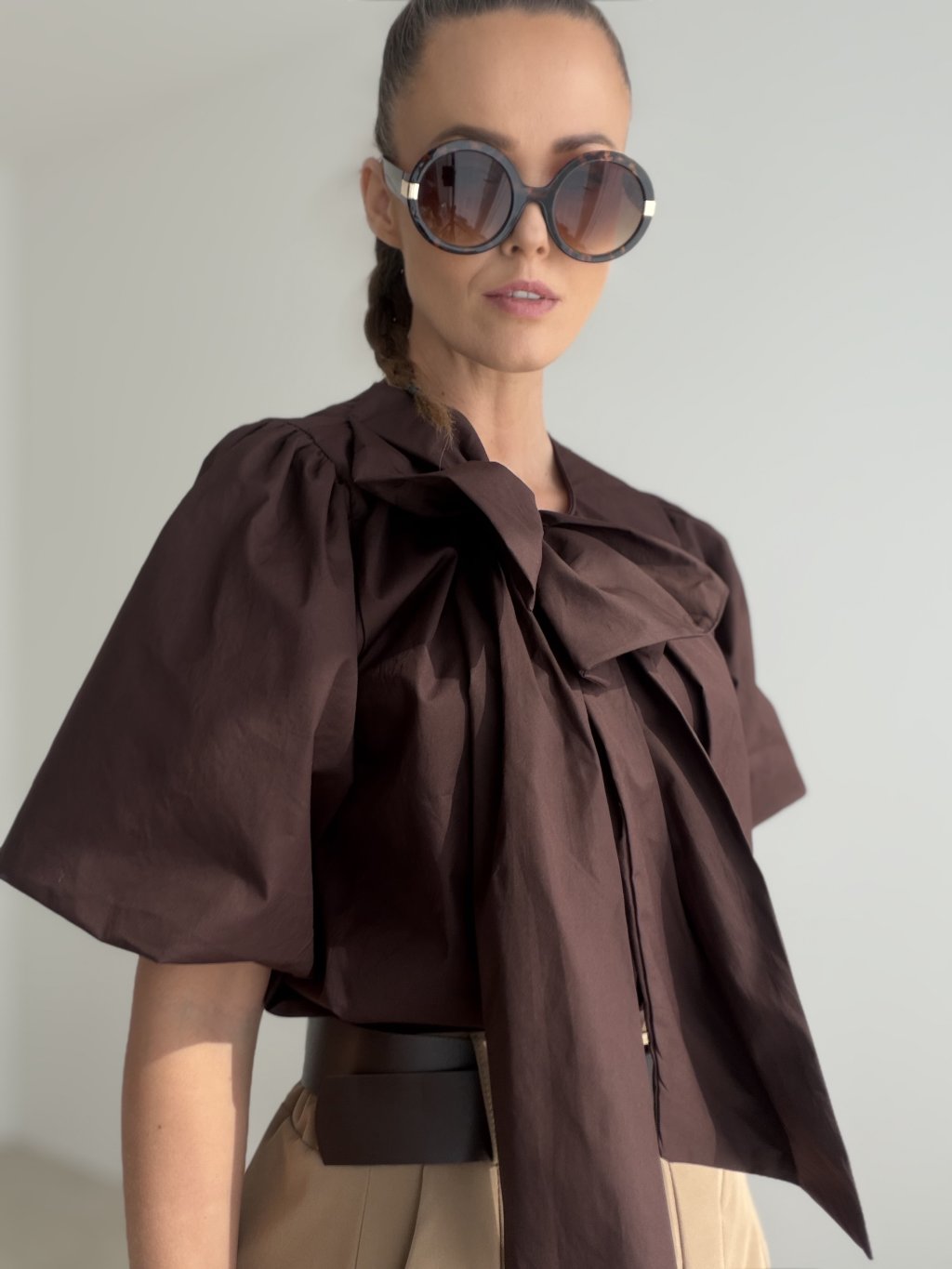 Elegantná bavlnená blúzka s výraznými rukávmi a efektným viazaním pri krku, ktorá pôsobí žensky a sofistikovane. Skvelý kúsok do elegantných aj smart casual outfitov.