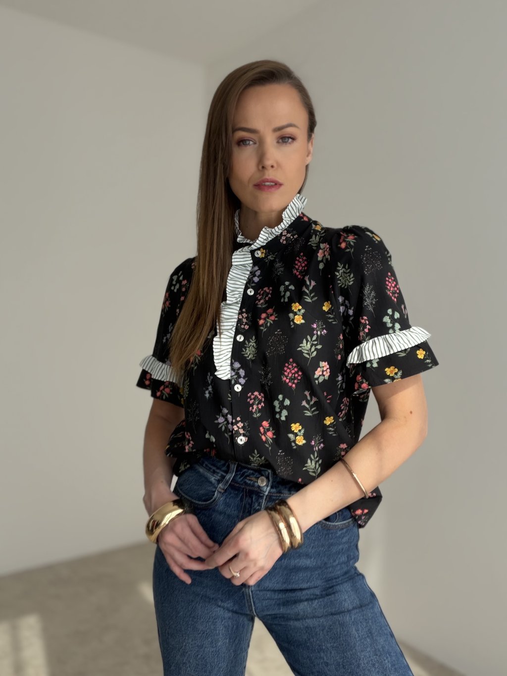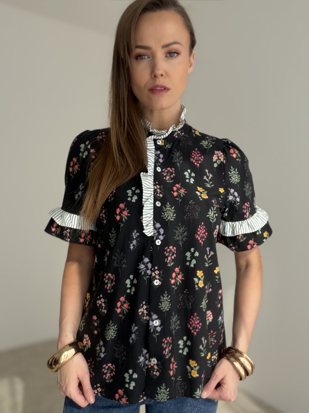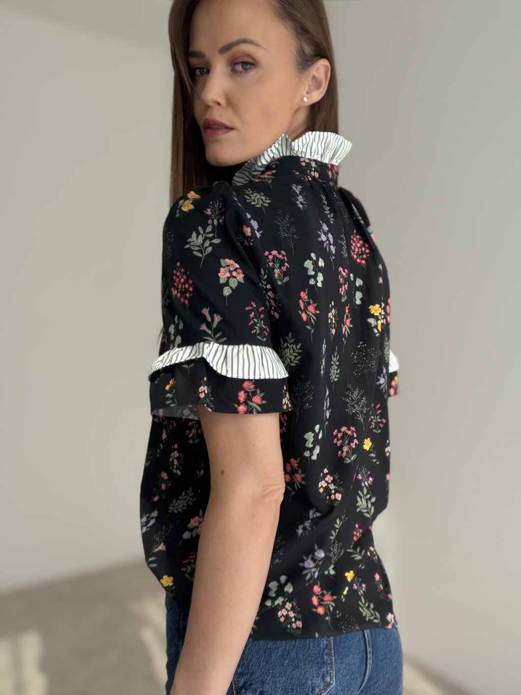 Romantická košeľa s kvetinovým vzorom a výraznými volánovými detailmi pôsobí žensky, elegantne a originálne. Je ideálnou voľbou na každodenné nosenie aj štýlové outfitové kombinácie.