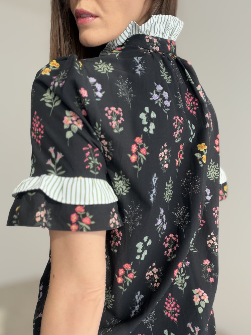 Táto košeľa je výrazným a zároveň veľmi ženským kúskom, ktorý okamžite zaujme svojím romantickým vzhľadom a prepracovanými detailmi. Jemný kvetinový vzor pôsobí elegantne a nežne, zatiaľ čo kontrastné volánové lemovanie pri golieri, zapínaní a rukávoch dodáva modelu originálny charakter. Strih pôsobí ľahko, vzdušne a veľmi príjemne na nosenie, vďaka čomu je košeľa ideálnou voľbou na bežný deň aj špeciálnejšie príležitosti.