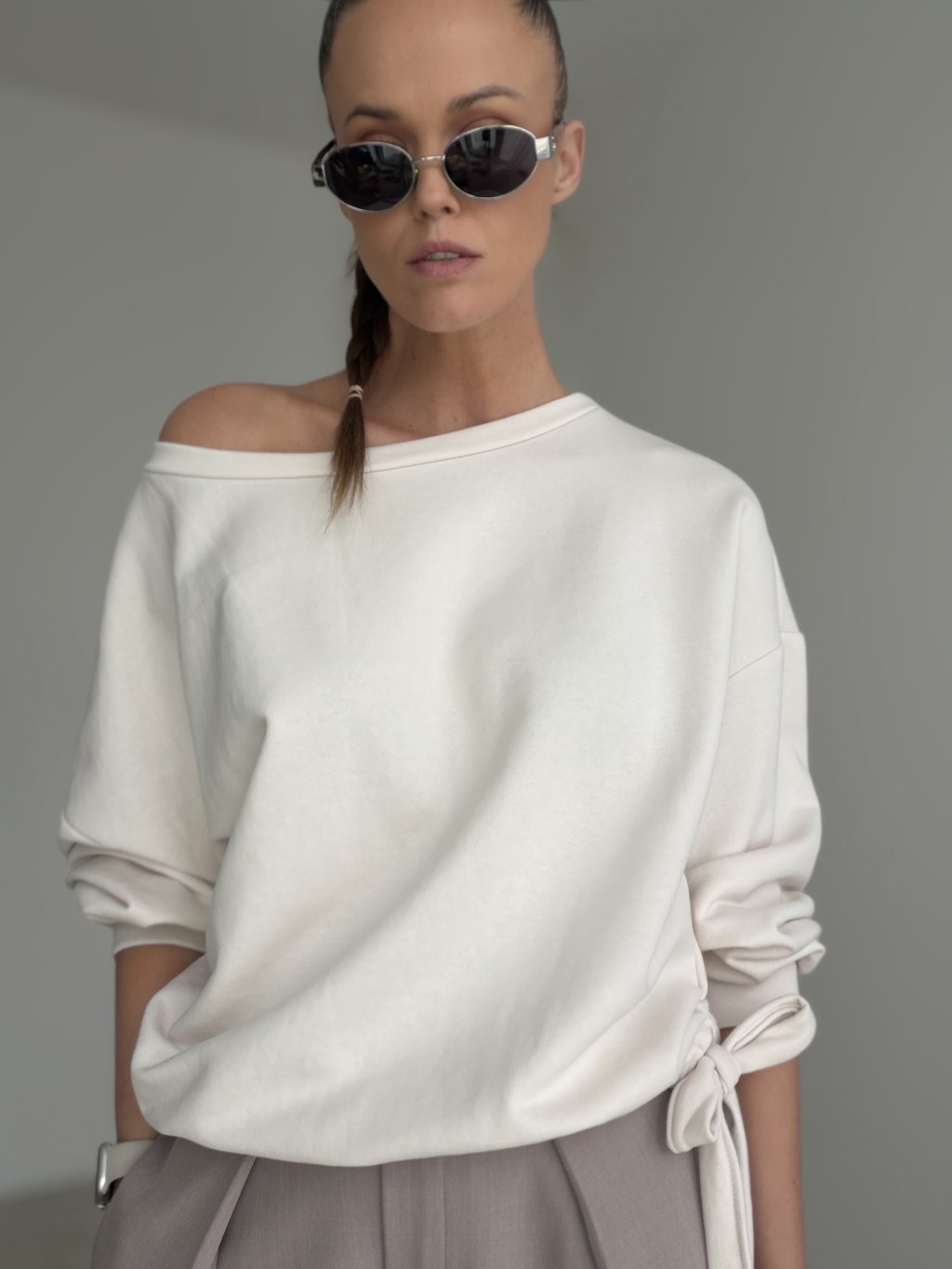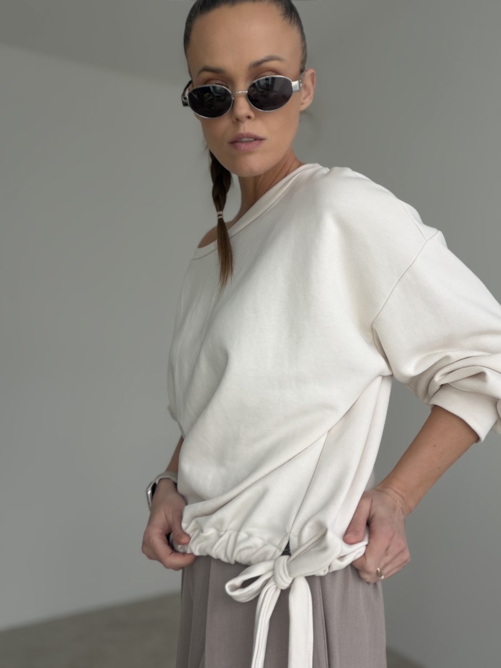Dominantným detailom je viazanie v spodnej časti, ktoré umožňuje prispôsobiť si siluetu podľa vlastných predstáv. Mikinu môžeš nosiť voľnejšie pre ležérny mestský look alebo viac stiahnuť v páse, ak chceš zvýrazniť postavu. Skvelo sa kombinuje s rifľami, nohavicami s vysokým pásom aj so sukňou a hodí sa na bežné nosenie, stretnutie v meste aj na dni, keď chceš vyzerať dobre bez zbytočného premýšľania nad outfitom.