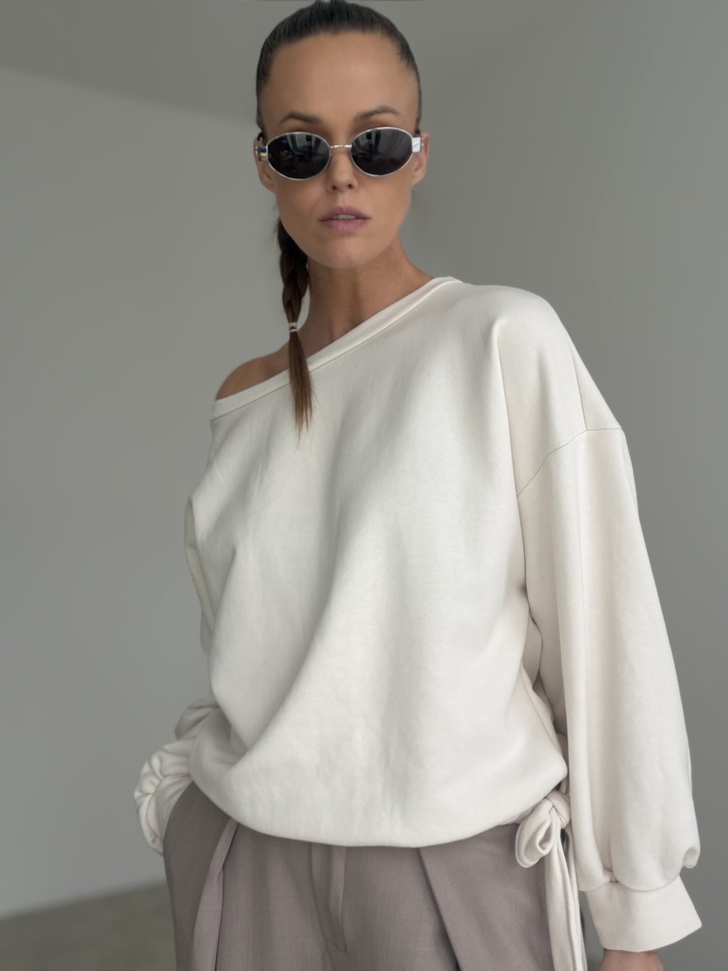 Bavlnená oversize mikina s voľným strihom, ženským výstrihom a viazaním v páse. Pohodlný a štýlový kúsok, ktorý ľahko skombinuješ do ležérnych aj modernejších outfitov.