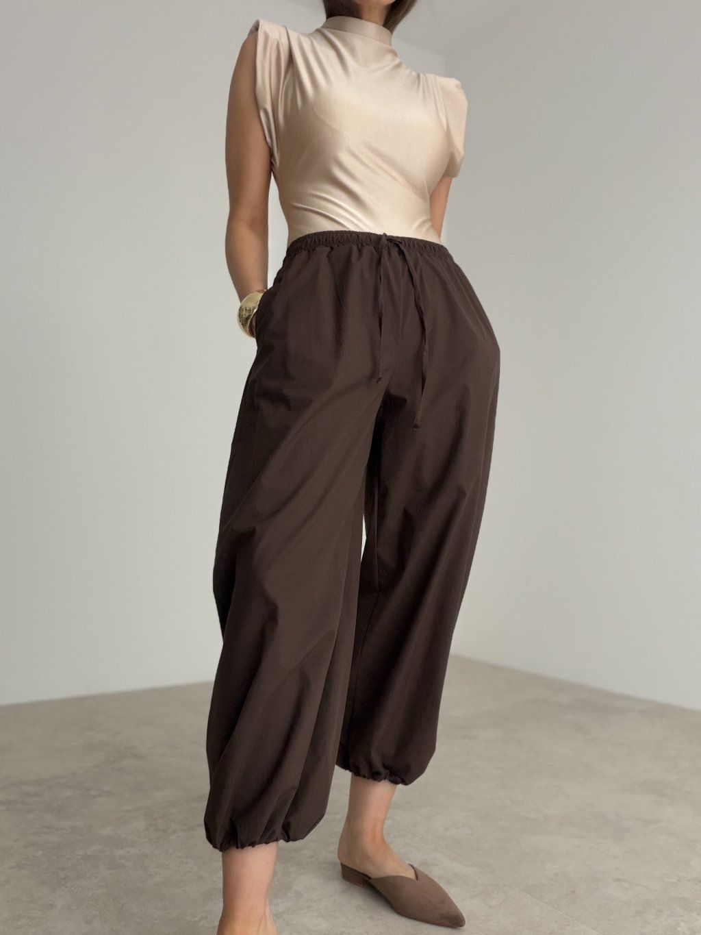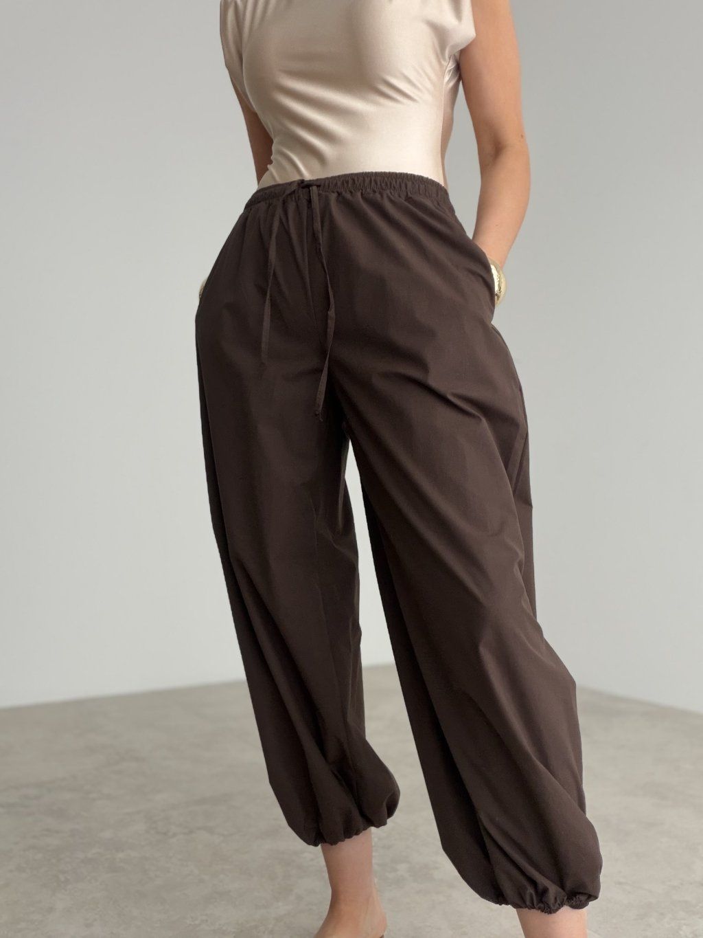 Originálne nohavice s voľným strihom, pružným pásom a jemným sťahovaním v spodnej časti. Výrazný a pohodlný kúsok, ktorý dodá outfitu moderný charakter.