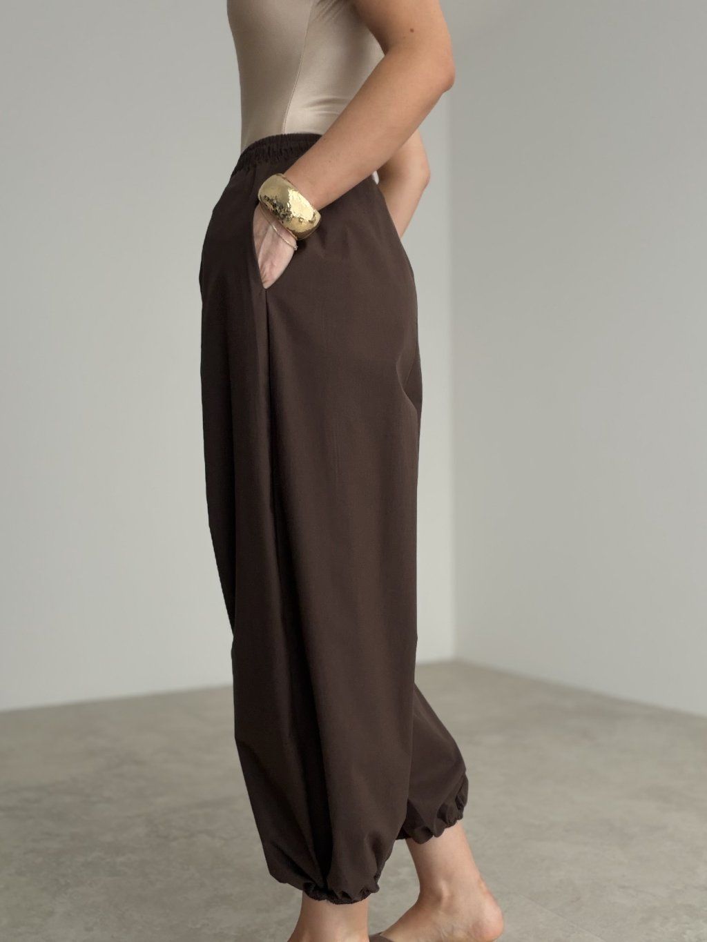 Tieto nohavice zaujmú na prvý pohľad svojím výrazným, no zároveň elegantným strihom. Voľnejšia silueta, pružný pás a jemné sťahovanie v spodnej časti vytvárajú moderný a originálny vzhľad, ktorý pôsobí štýlovo a zároveň veľmi pohodlne. Sú ideálnou voľbou pre ženy, ktoré majú rady výraznejšie kúsky s módnym charakterom.