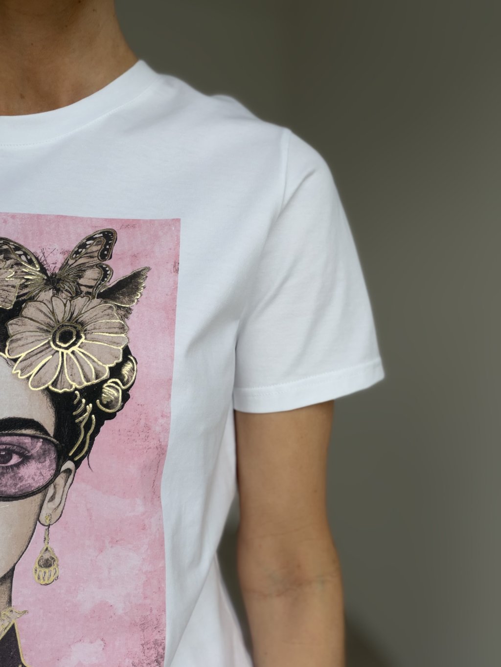 Bavlnené tričko s výraznou potlačou a zlatým detailom. Odporúčame ručné pranie a nedávať do sušičky.