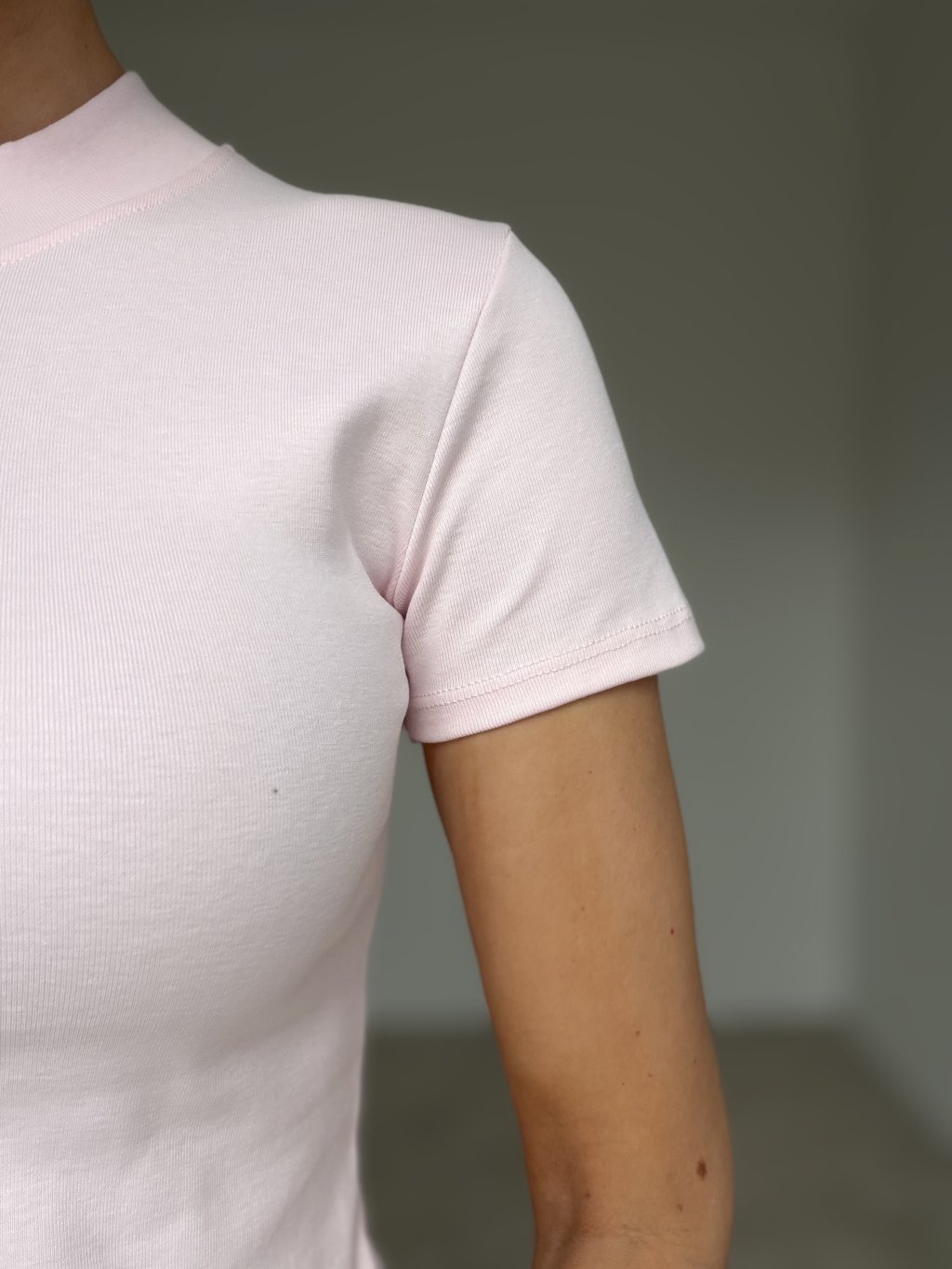 Bavlnený top s krátkymi rukávmi a vyšším okrúhlym výstrihom. Priliehavý, pohodlný a ľahko kombinovateľný do každodenných aj elegantnejších outfitov.
