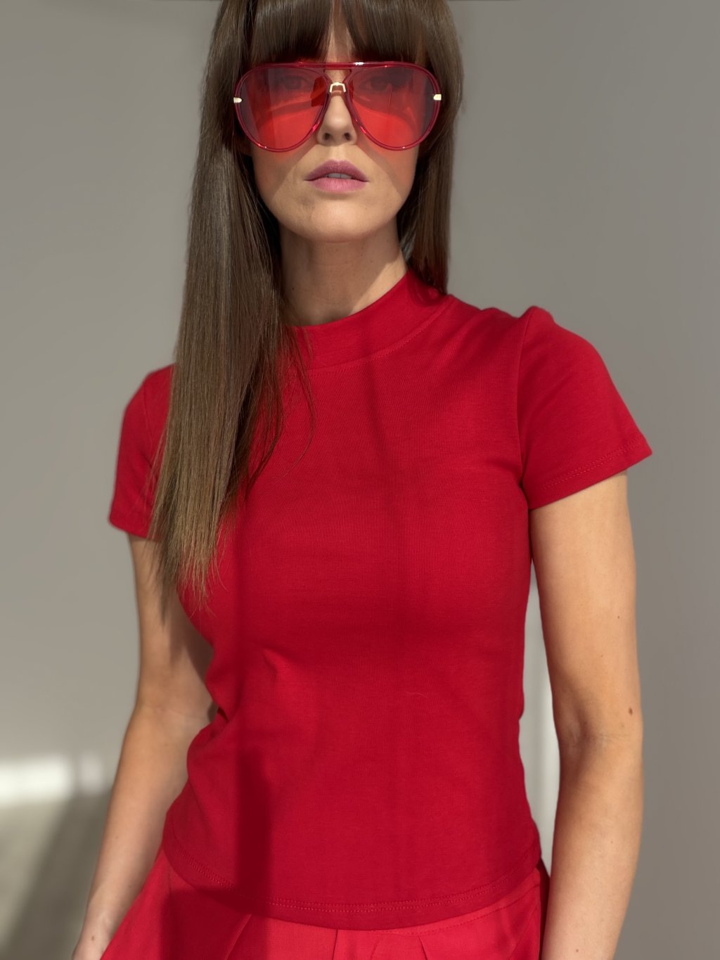 Bavlnený top s krátkymi rukávmi a vyšším okrúhlym výstrihom. Priliehavý, pohodlný a ľahko kombinovateľný do každodenných aj elegantnejších outfitov.