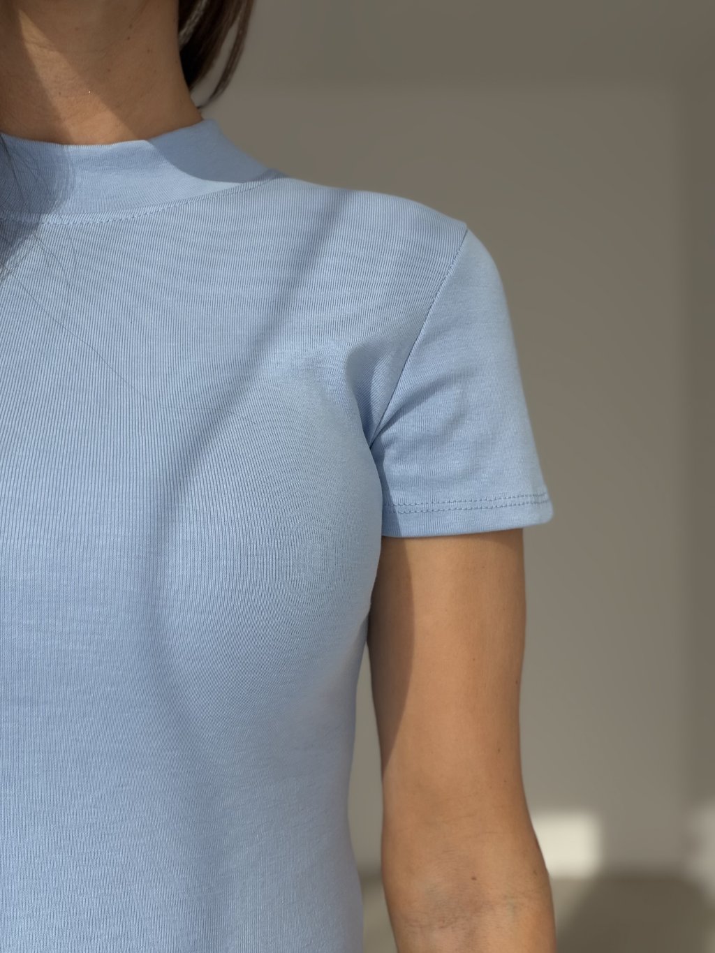 Bavlnený top s krátkymi rukávmi a vyšším okrúhlym výstrihom. Priliehavý, pohodlný a ľahko kombinovateľný do každodenných aj elegantnejších outfitov.