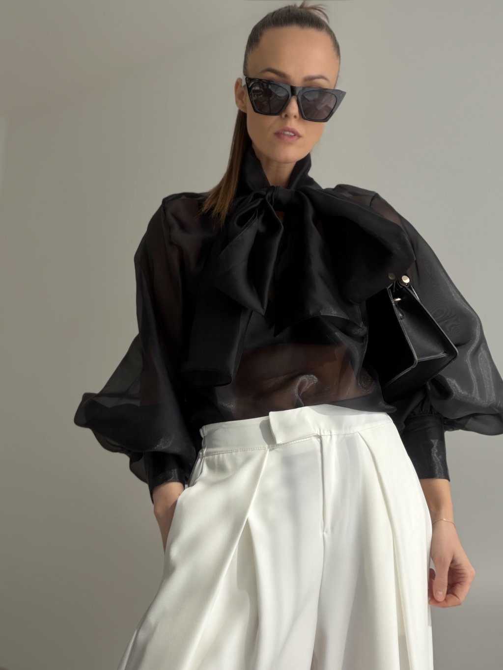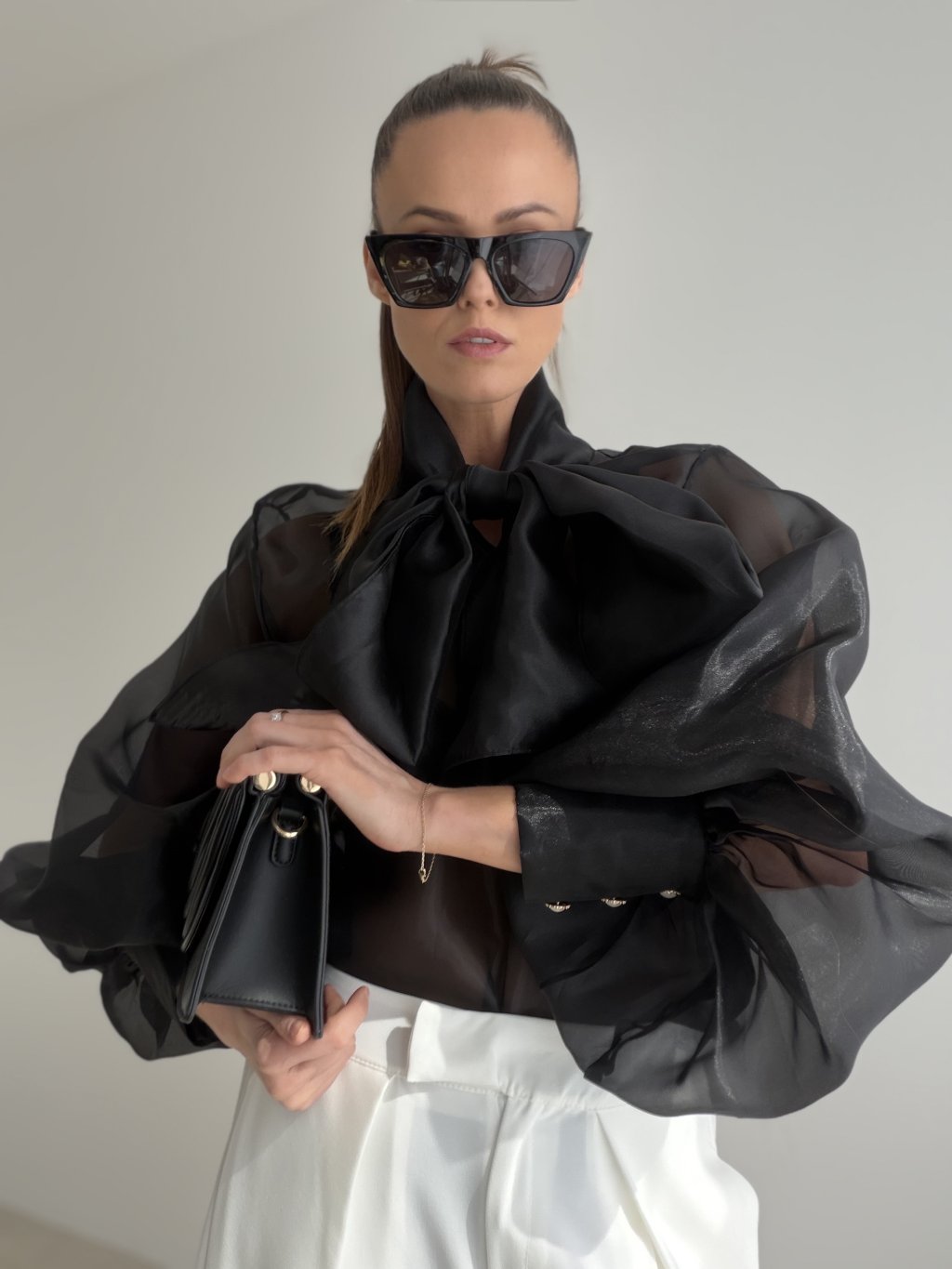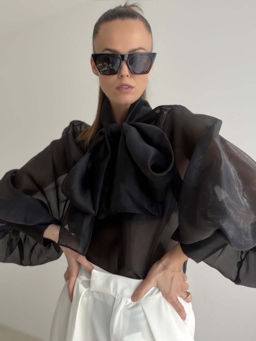 Blúzka s mašľou je výrazný a elegantný kúsok, ktorý okamžite pritiahne pozornosť svojím jemným, ženským a sofistikovaným vzhľadom. Transparentný materiál pôsobí ľahko, vzdušne a veľmi štýlovo, zatiaľ čo dominantná mašľa pri krku dodáva celému modelu luxusný a romantický charakter. Dlhé rukávy ukončené ozdobnými gombíkmi ešte viac podčiarkujú elegantný dojem a robia z tejto blúzky ideálny kúsok na výnimočné príležitosti aj štýlové kombinácie počas dňa. Skvelo sa hodí k nohaviciam s vysokým pásom, sukni aj elegantnému saku.
