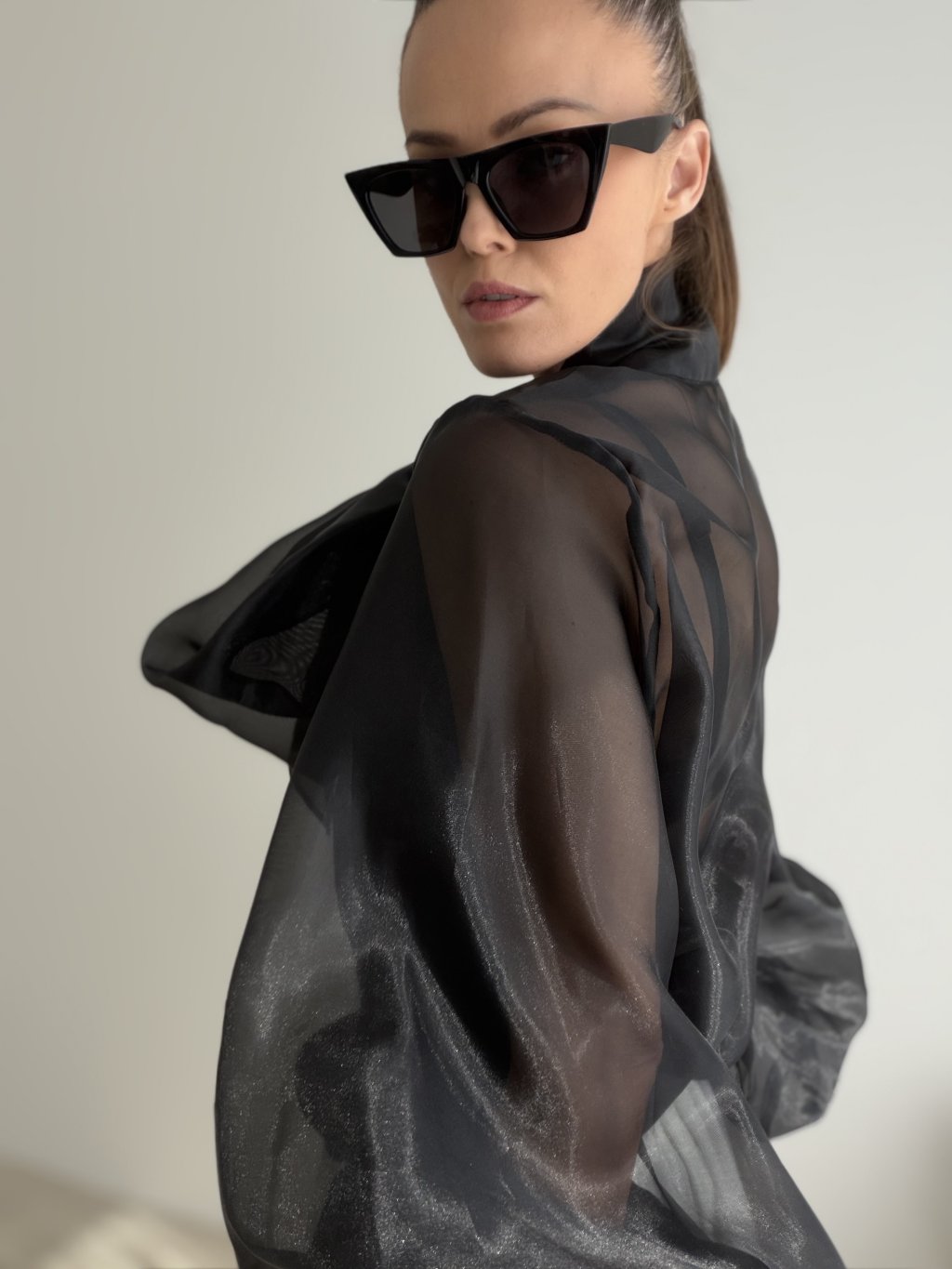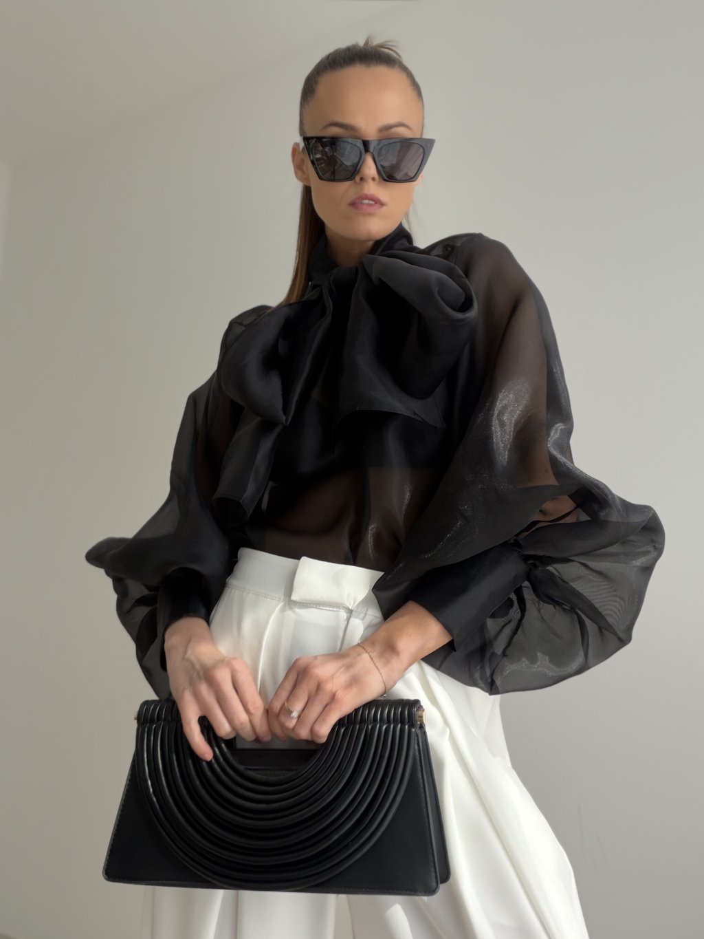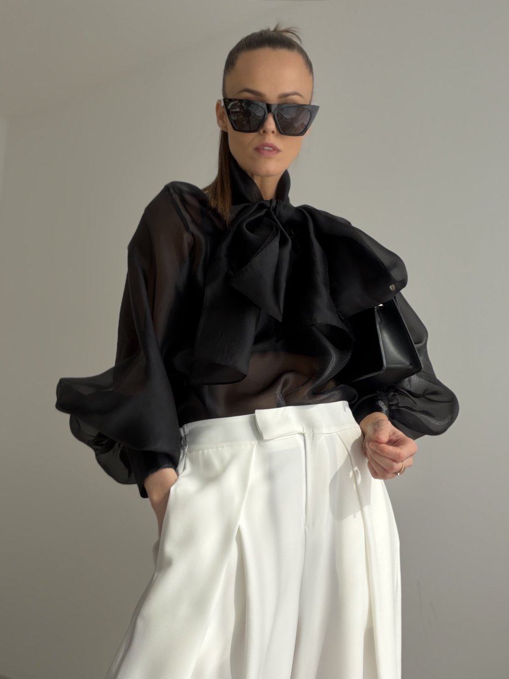 Blúzka s mašľou je výrazný a elegantný kúsok, ktorý okamžite pritiahne pozornosť svojím jemným, ženským a sofistikovaným vzhľadom. Transparentný materiál pôsobí ľahko, vzdušne a veľmi štýlovo, zatiaľ čo dominantná mašľa pri krku dodáva celému modelu luxusný a romantický charakter. Dlhé rukávy ukončené ozdobnými gombíkmi ešte viac podčiarkujú elegantný dojem a robia z tejto blúzky ideálny kúsok na výnimočné príležitosti aj štýlové kombinácie počas dňa. Skvelo sa hodí k nohaviciam s vysokým pásom, sukni aj elegantnému saku.