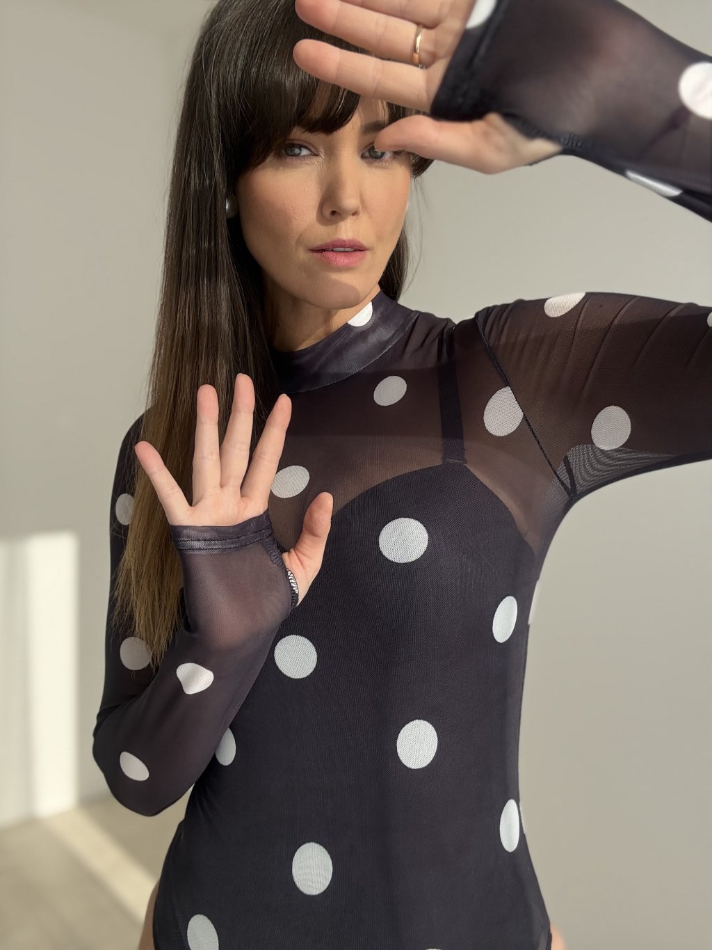 Body s bodkovaným vzorom je výrazný, no zároveň nositeľný kúsok, ktorý vie spraviť štýl aj z úplne jednoduchého outfitu. Priehľadný, jemný materiál pôsobí ľahko a elegantne, zatiaľ čo priliehavý strih krásne kopíruje postavu a drží na mieste počas celého dňa. Dlhé rukávy a vyšší stojatý golier dodávajú celku moderný, sofistikovaný charakter. Body sa výborne kombinuje s džínsami, nohavicami s vysokým pásom aj so sukňou a vďaka svojmu vzhľadu je ideálne aj na vrstvenie pod sako alebo kabát.