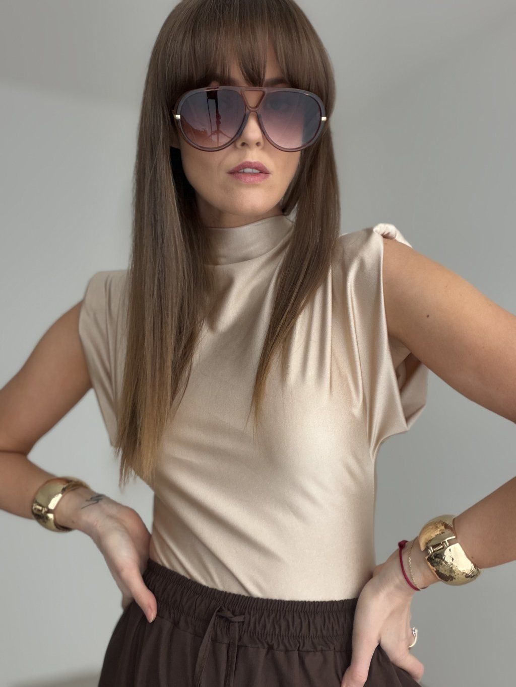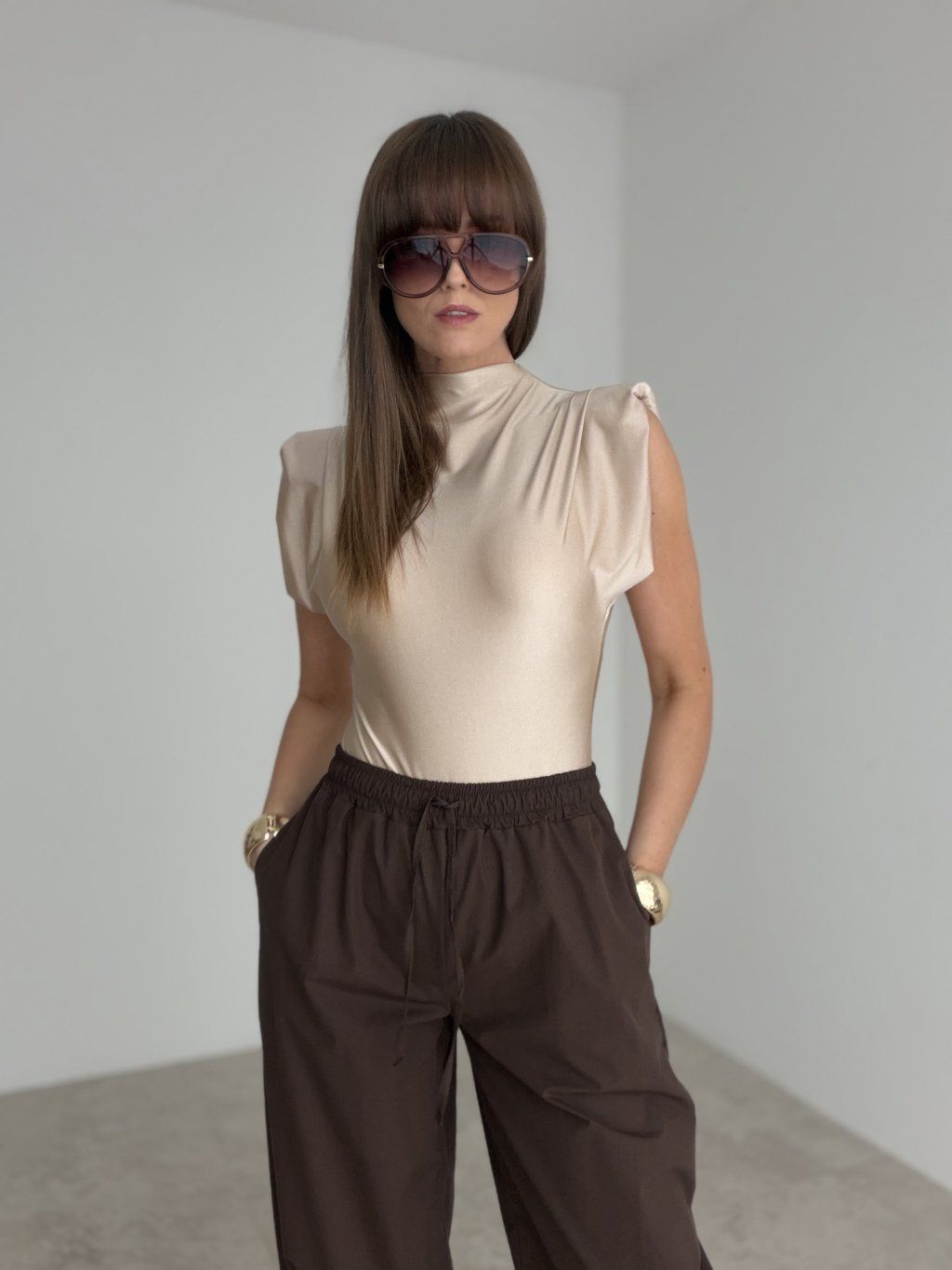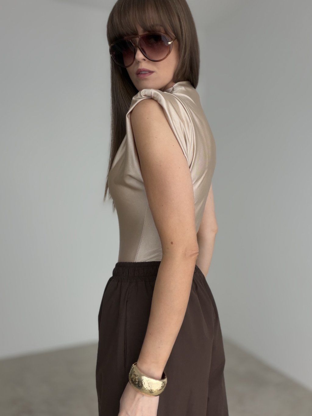 Body s výraznými ramennými vypchávkami prináša moderný, elegantný a perfektne tvarovaný vzhľad. Hladký, jemne lesklý materiál pôsobí luxusne a krásne obopína postavu. Stojačik a padajúce riasenie v hornej časti pridávajú modelu štruktúru a vytvárajú čistú, sofistikovanú líniu.