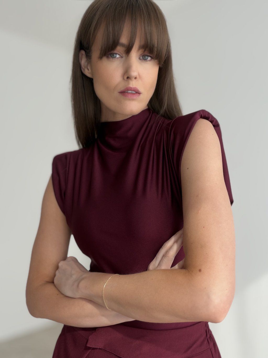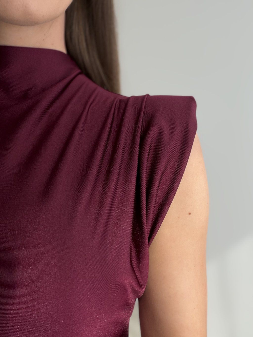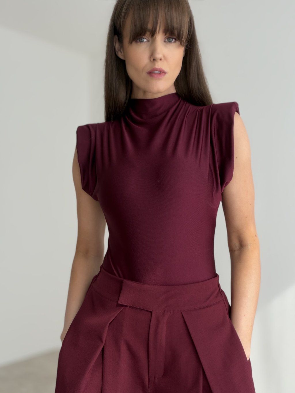 Body s výraznými ramennými vypchávkami prináša moderný, elegantný a perfektne tvarovaný vzhľad. Hladký, jemne lesklý materiál pôsobí luxusne a krásne obopína postavu. Stojačik a padajúce riasenie v hornej časti pridávajú modelu štruktúru a vytvárajú čistú, sofistikovanú líniu.