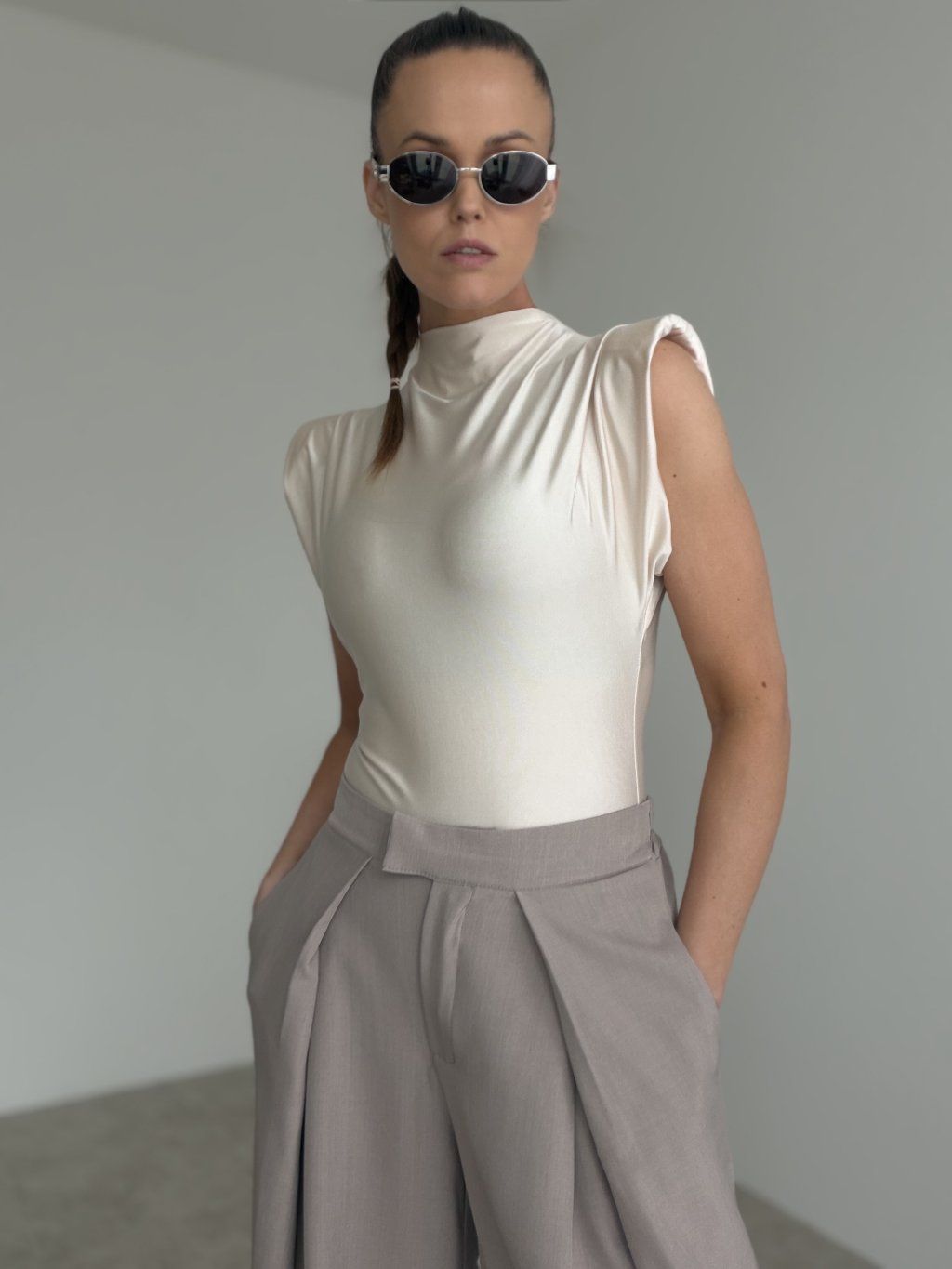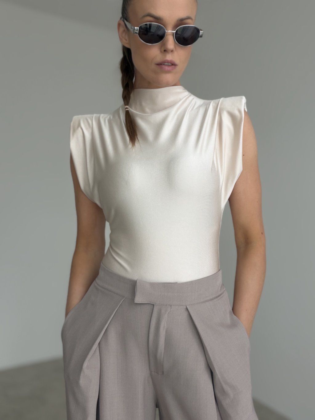 Body s výraznými ramennými vypchávkami prináša moderný, elegantný a perfektne tvarovaný vzhľad. Hladký, jemne lesklý materiál pôsobí luxusne a krásne obopína postavu. Stojačik a padajúce riasenie v hornej časti pridávajú modelu štruktúru a vytvárajú čistú, sofistikovanú líniu.