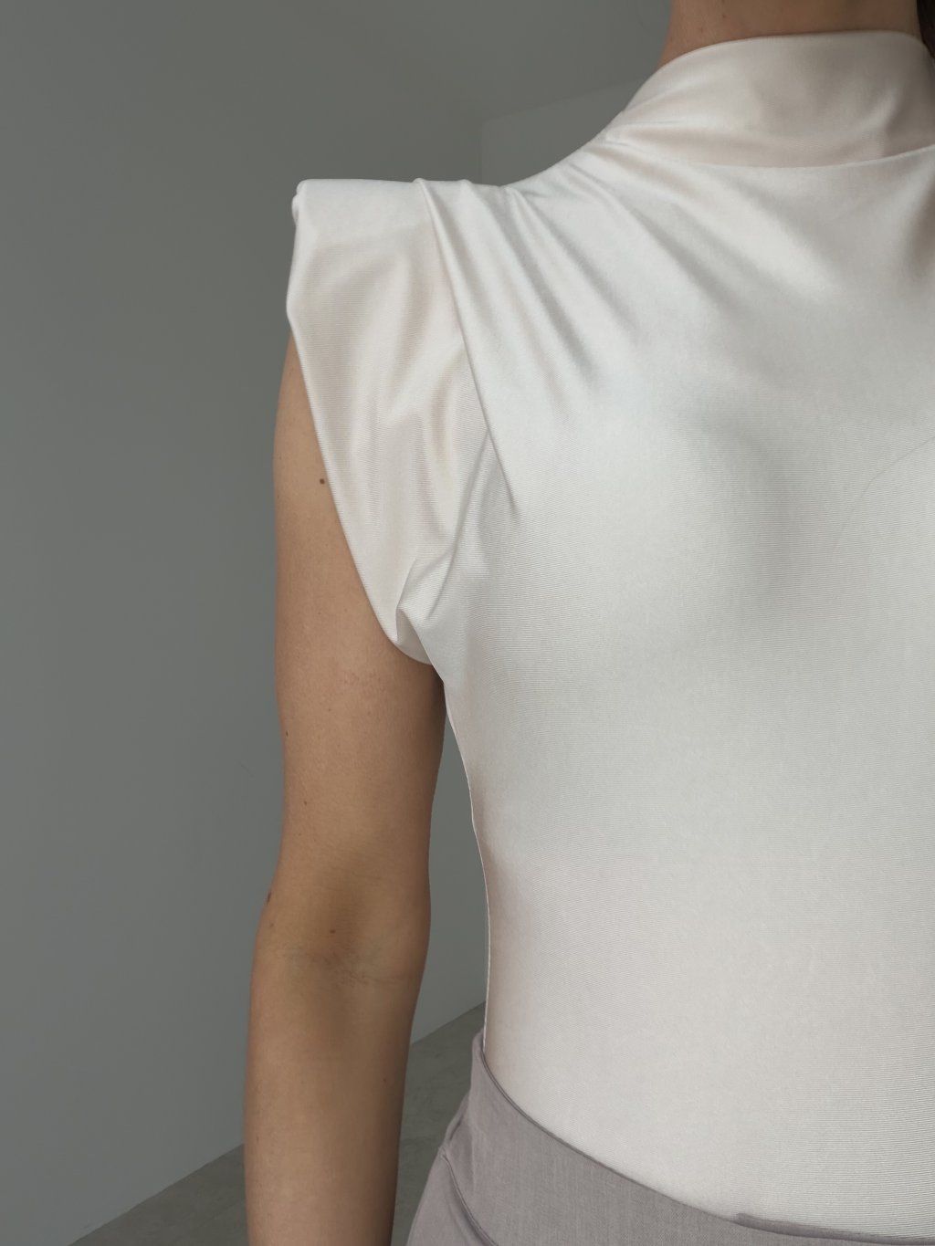 Elegantné body s ramennými vypchávkami, stojačikom a hladkým, jemne lesklým povrchom. Moderný kúsok, ktorý krásne formuje postavu.