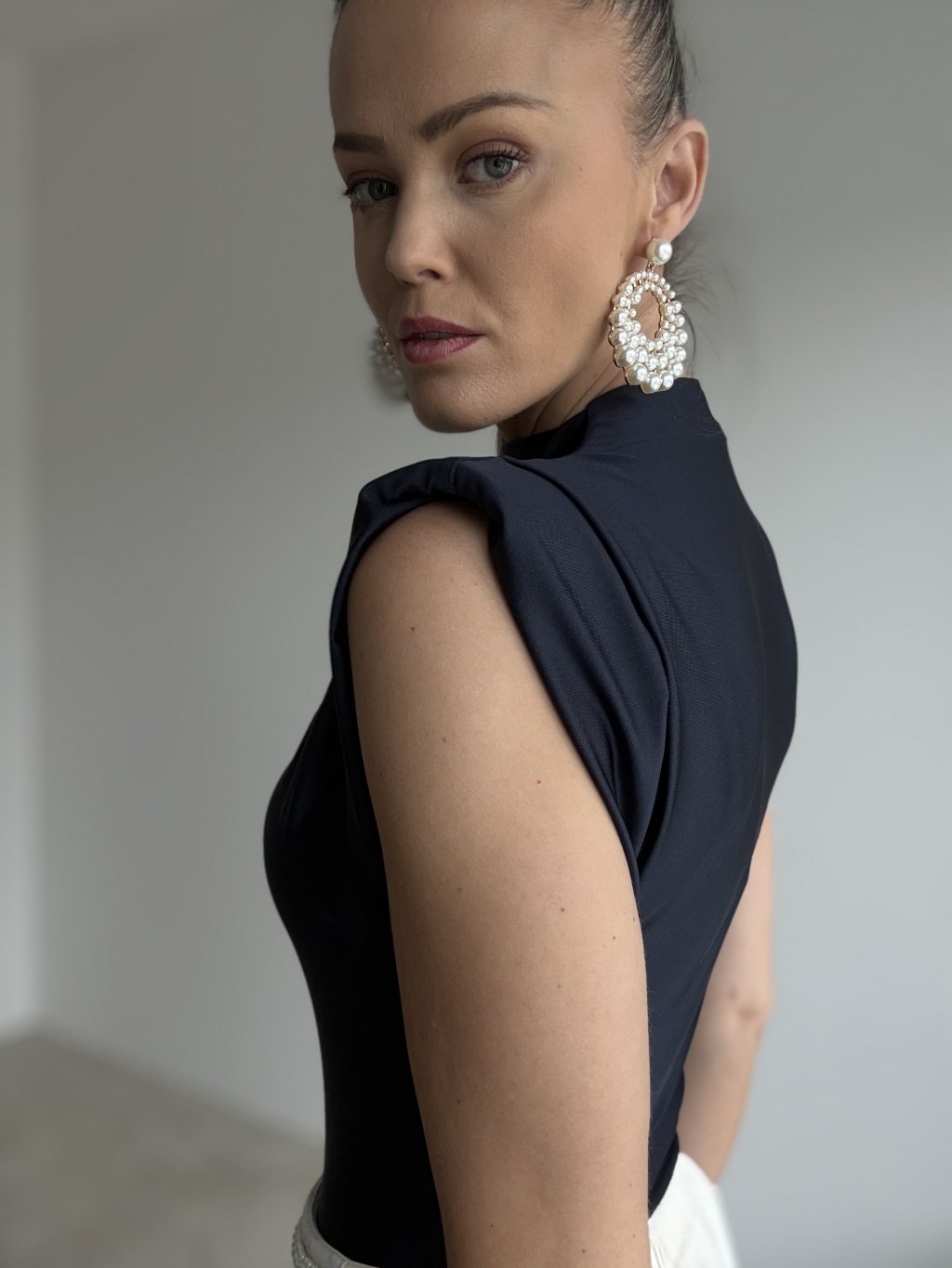 Elegantné body s ramennými vypchávkami, stojačikom a hladkým, jemne lesklým povrchom. Moderný kúsok, ktorý krásne formuje postavu.