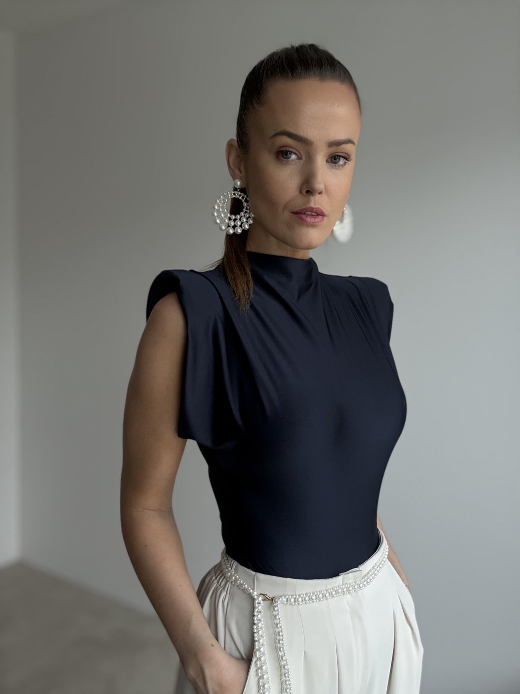 Body s výraznými ramennými vypchávkami prináša moderný, elegantný a perfektne tvarovaný vzhľad. Hladký, jemne lesklý materiál pôsobí luxusne a krásne obopína postavu. Stojačik a padajúce riasenie v hornej časti pridávajú modelu štruktúru a vytvárajú čistú, sofistikovanú líniu.