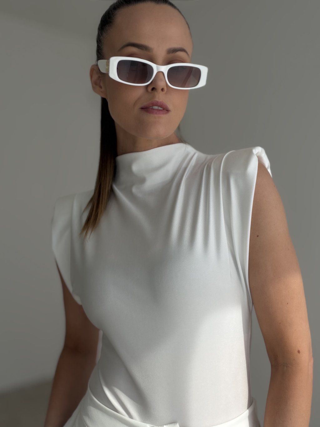 Body s výraznými ramennými vypchávkami prináša moderný, elegantný a perfektne tvarovaný vzhľad. Hladký, jemne lesklý materiál pôsobí luxusne a krásne obopína postavu. Stojačik a padajúce riasenie v hornej časti pridávajú modelu štruktúru a vytvárajú čistú, sofistikovanú líniu.