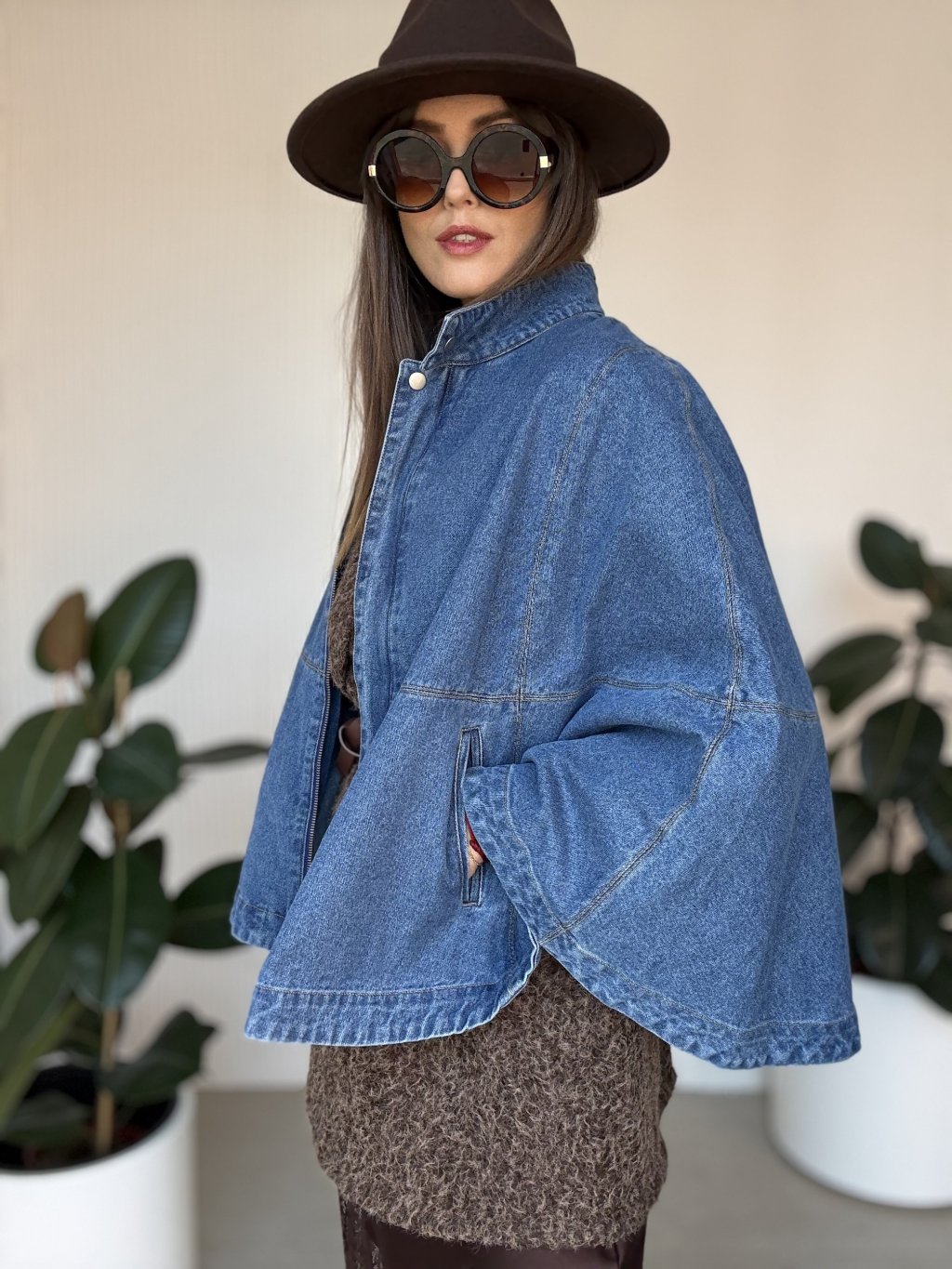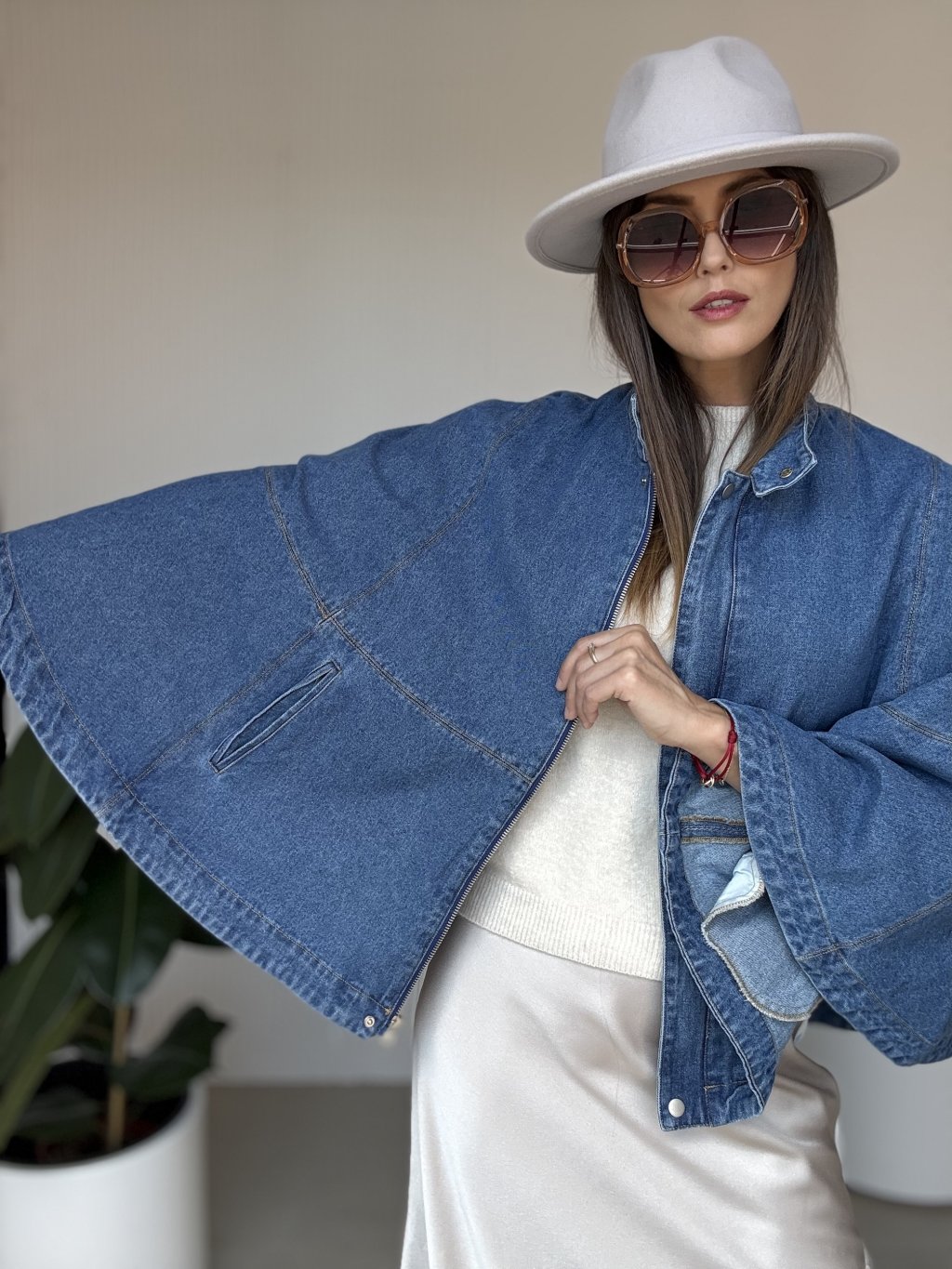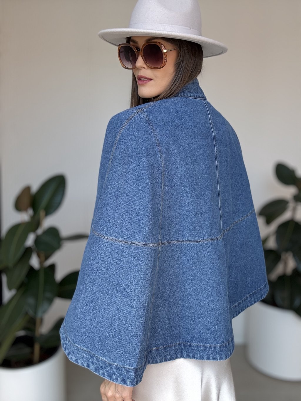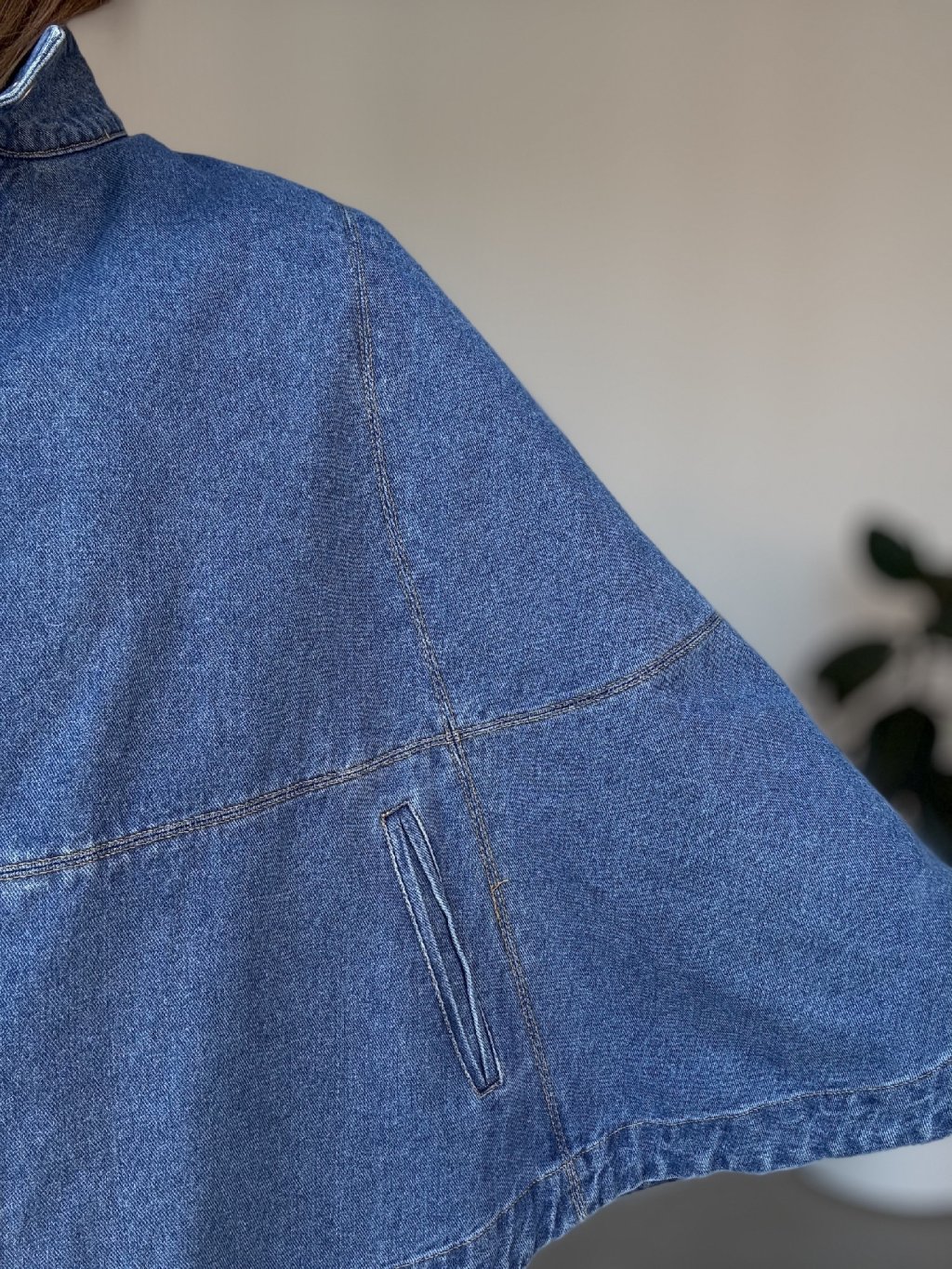 Denimová pelerína so širokými rukávmi pre moderný a štýlový vzhľad.