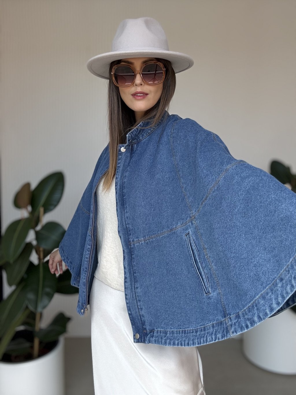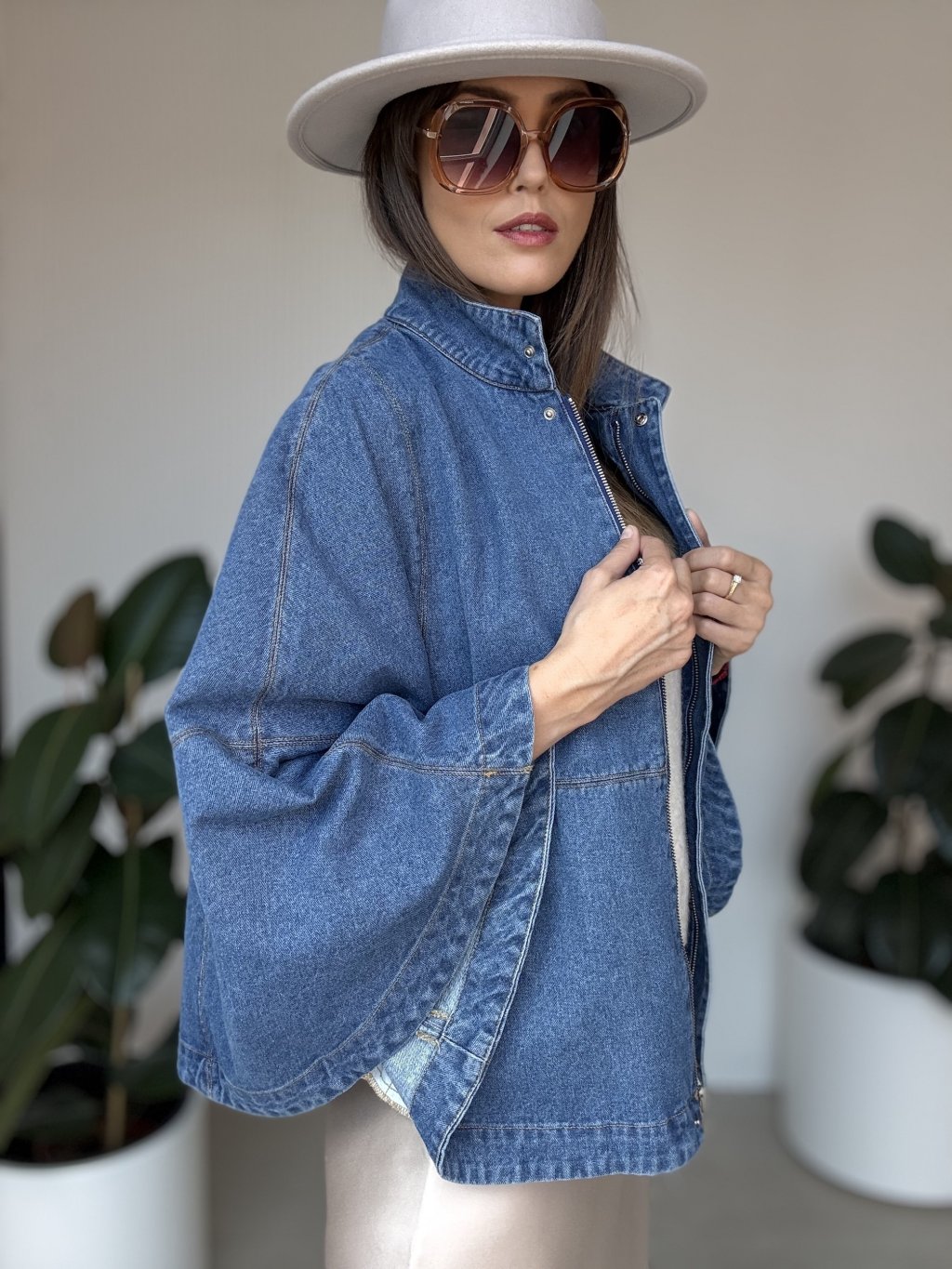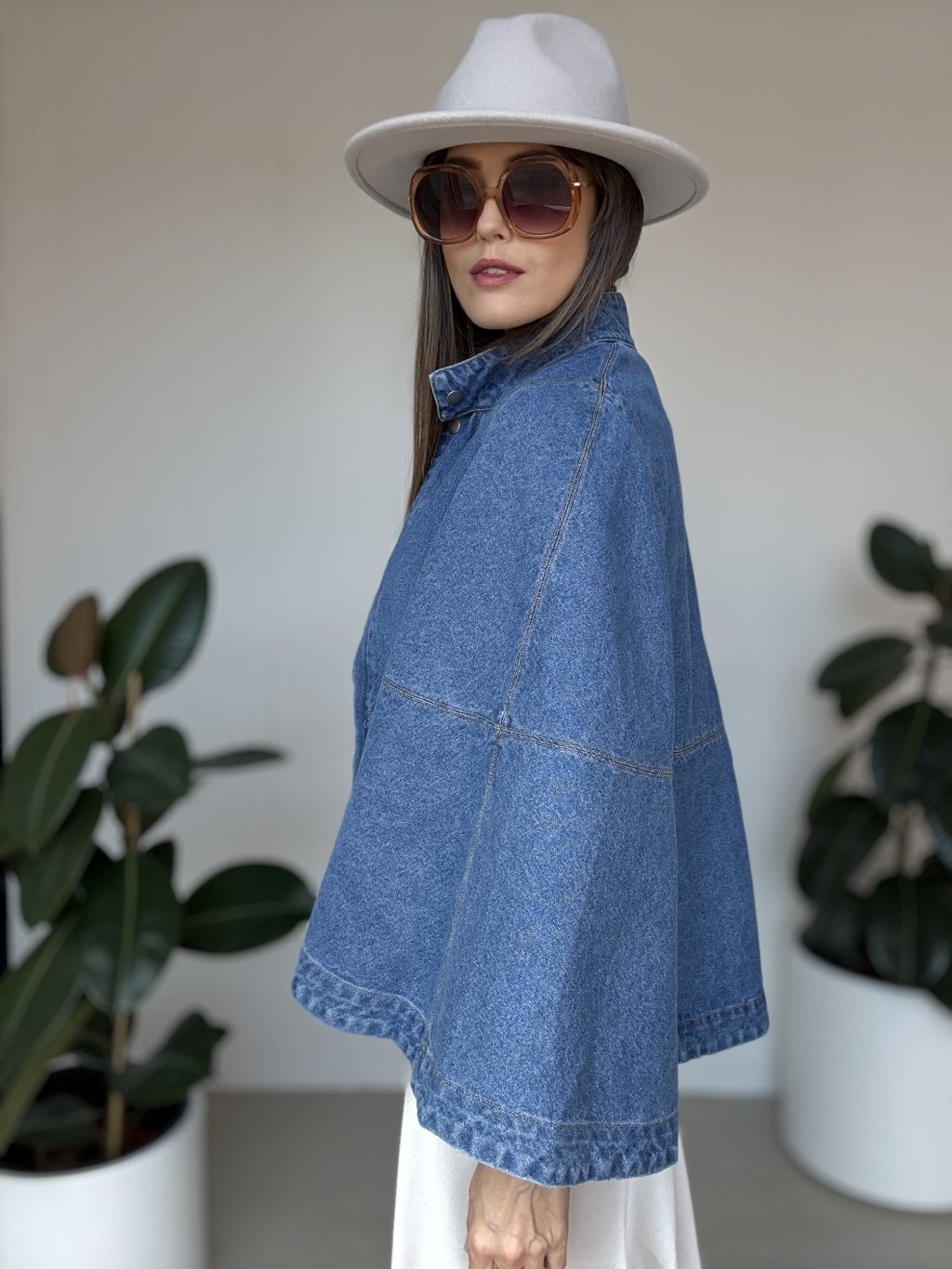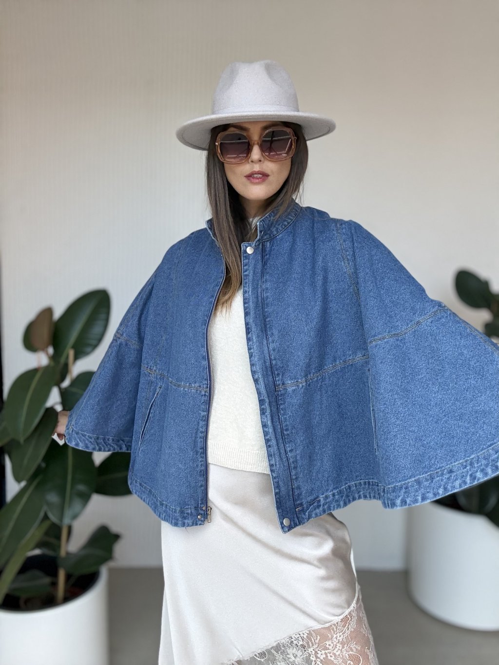 Denimová pelerína so širokými rukávmi pre moderný a štýlový vzhľad.