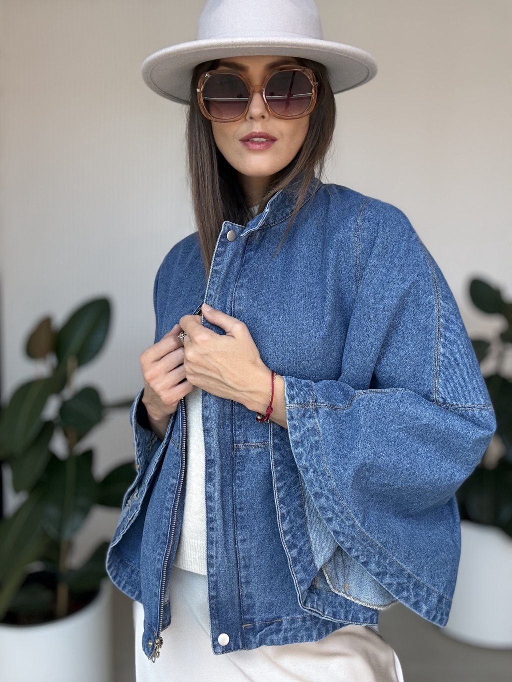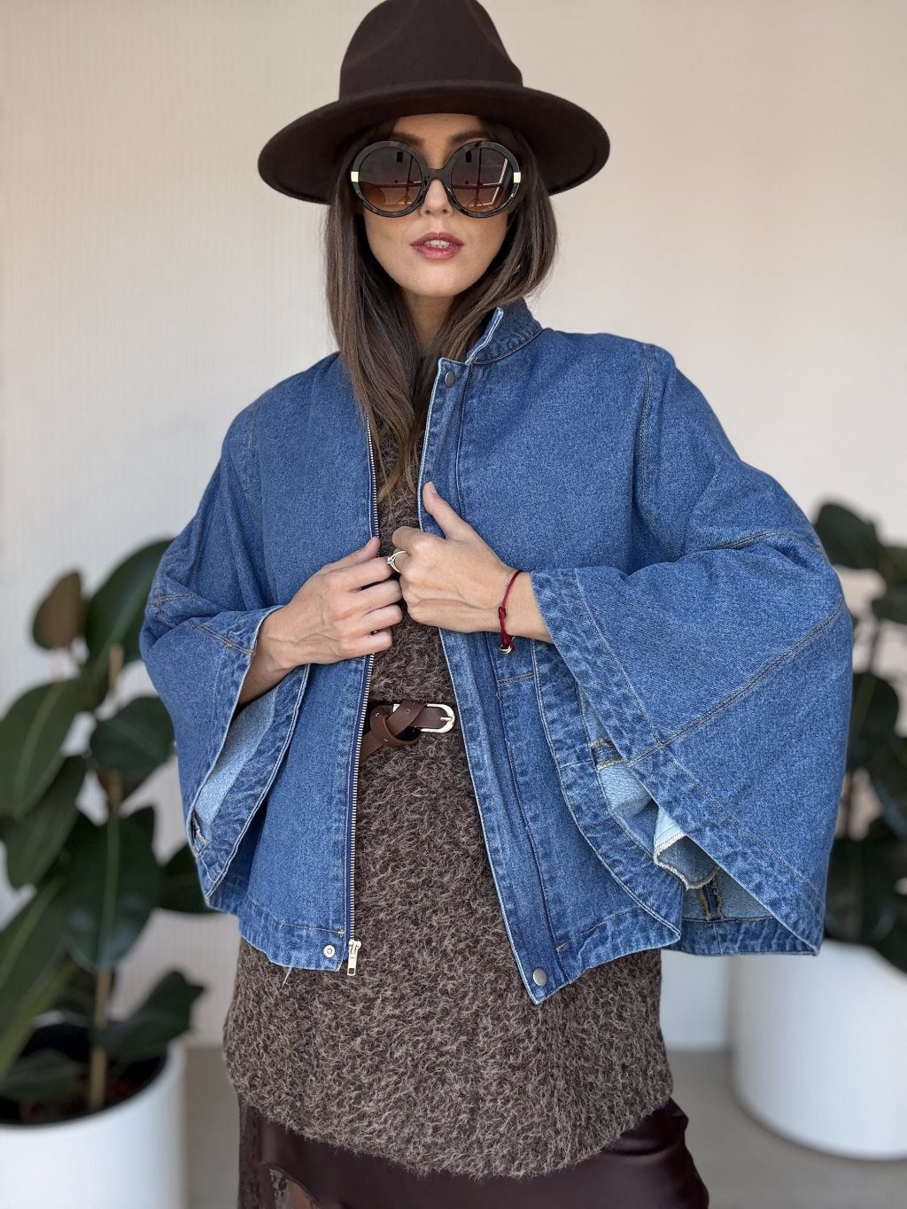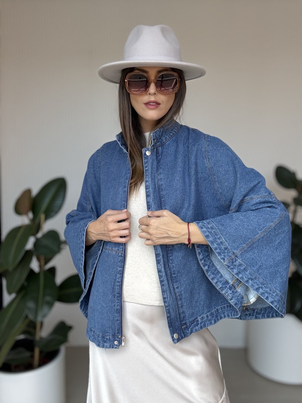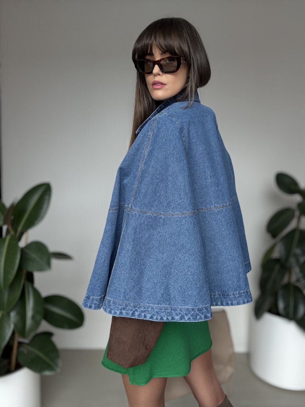 Denimová pelerína so širokými rukávmi pre moderný a štýlový vzhľad.