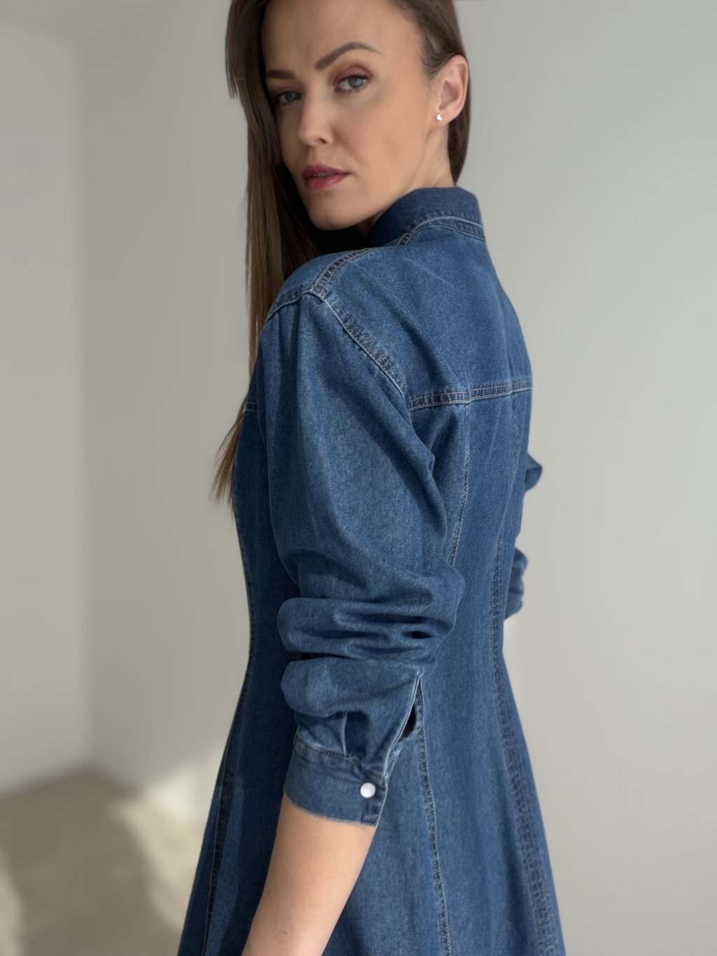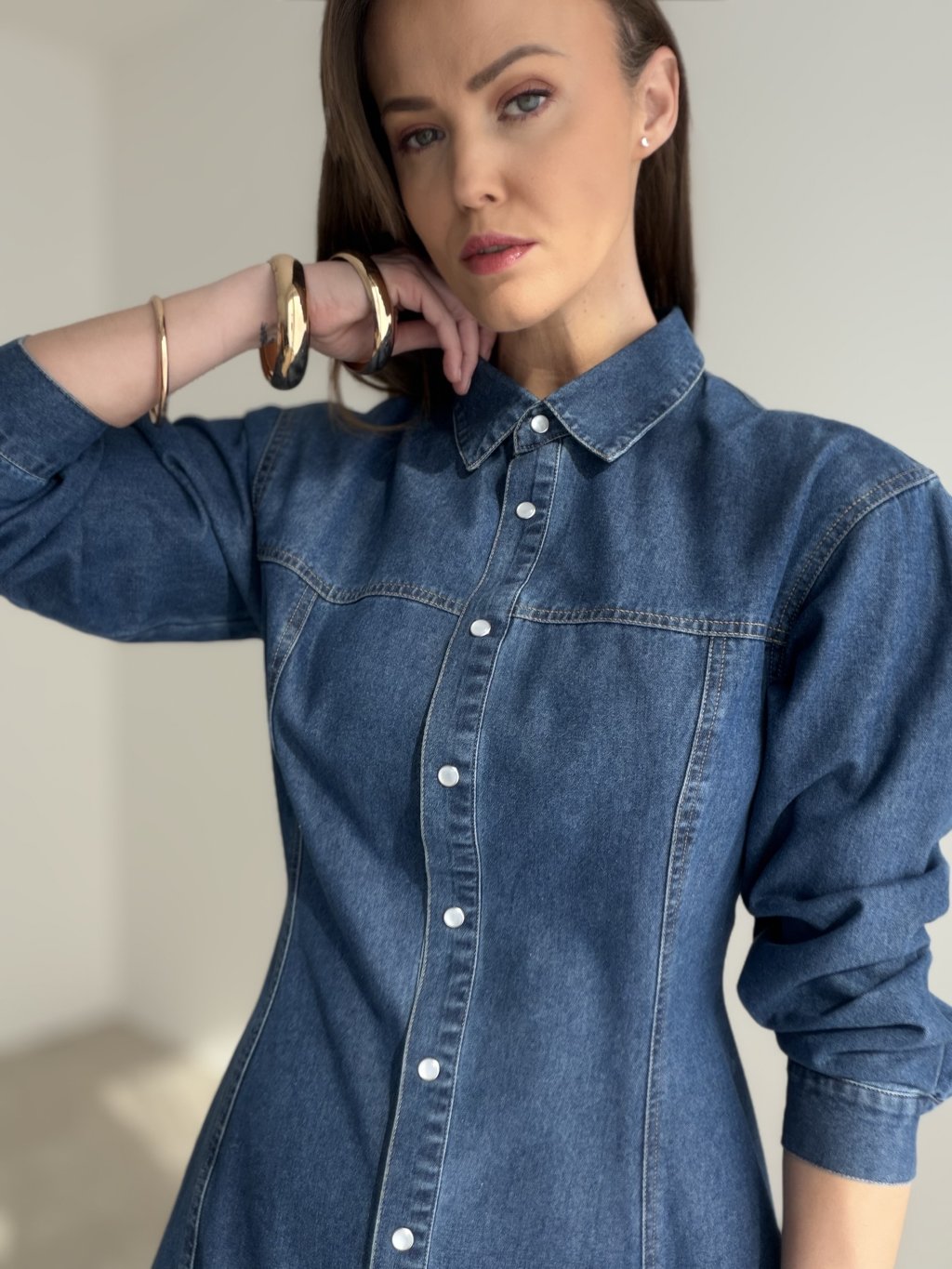 Tieto denimové šaty sú nadčasovým kúskom, ktorý dokonale spája ženskosť, štýl a každodennú nositeľnosť. Ich košeľový strih pôsobí elegantne a upravene, zatiaľ čo jemne tvarovaná silueta krásne zvýrazňuje postavu. Zapínanie po celej dĺžke dodáva modelu klasický charakter a zároveň umožňuje jednoduché a pohodlné nosenie. Dlhé rukávy a precízne línie šiat vytvárajú veľmi lichotivý, moderný vzhľad, ktorý sa hodí na bežný deň aj na príležitosti, keď chceš pôsobiť o niečo výraznejšie.