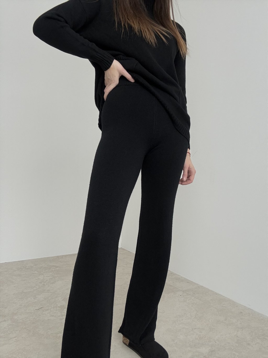 Pohodlný dvojdielny úpletový komplet s voľnejším vrchom a nohavicami s pružným pásom a mierne rozšírenými nohavicami. Skvelý na každodenné nosenie aj cestovanie.