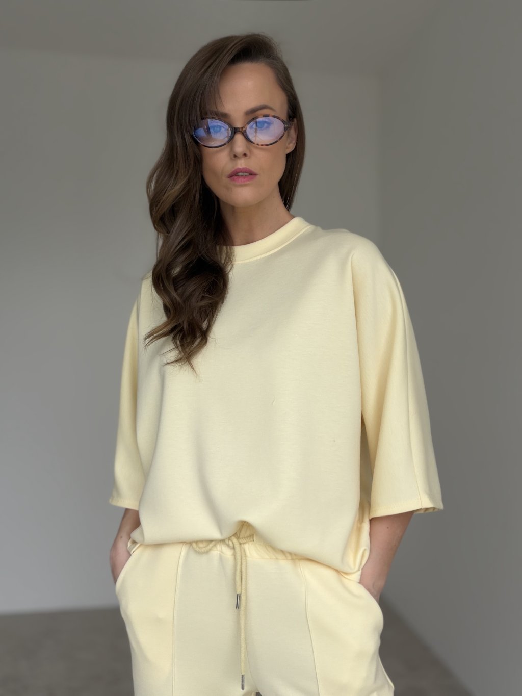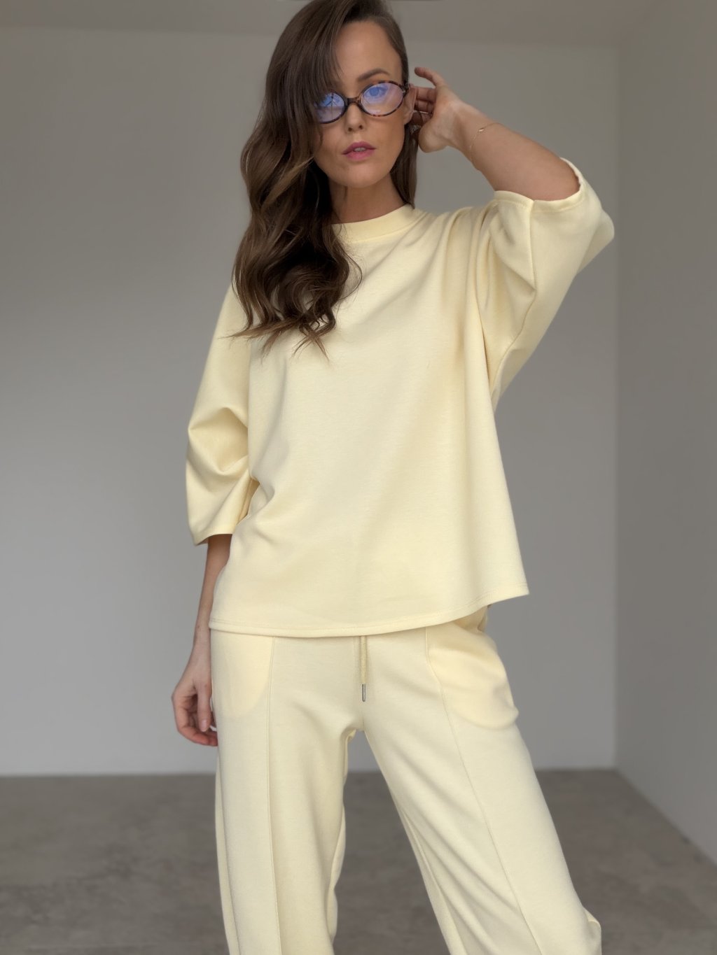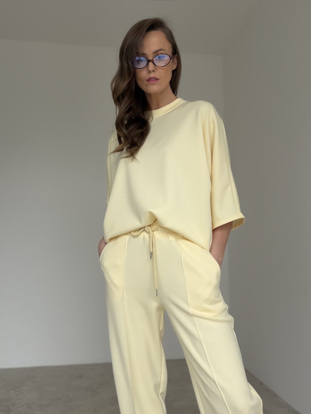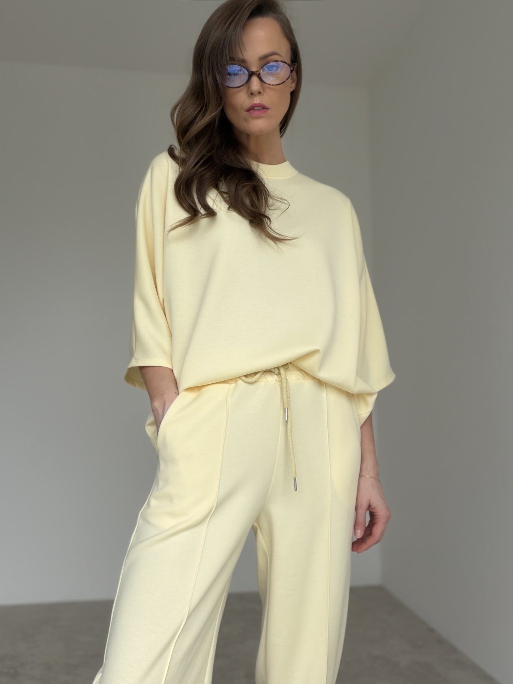 Pohodlný dvojdielny komplet z príjemného úpletu je ideálny na dni, keď chceš vyzerať upravene a zároveň sa cítiť maximálne komfortne. Voľnejší top s okrúhlym výstrihom a spadnutým ramenom pôsobí moderne a ležérne, krásne splýva a neobmedzuje v pohybe. Nohavice majú elastický pás so sťahovaním na šnúrku, praktické vrecká a uvoľnený strih, ktorý sedí prirodzene a pohodlne. Set sa dá nosiť spolu ako celok, ale rovnako dobre funguje aj po častiach v kombinácii s ďalšími kúskami z tvojho šatníka.
