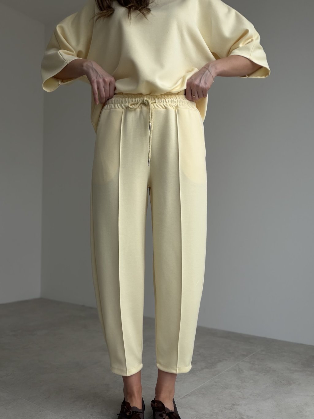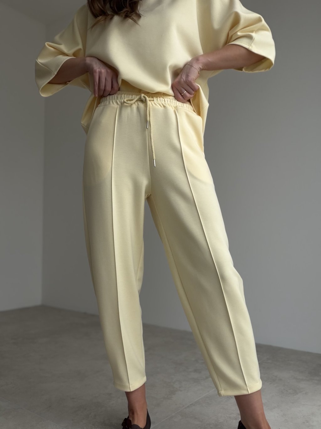 Dvojdielny komplet z príjemného úpletu s voľnejším topom a nohavicami s elastickým pásom a šnúrkou. Komfortný strih, vrecká, ideálny na každý deň aj cestovanie.