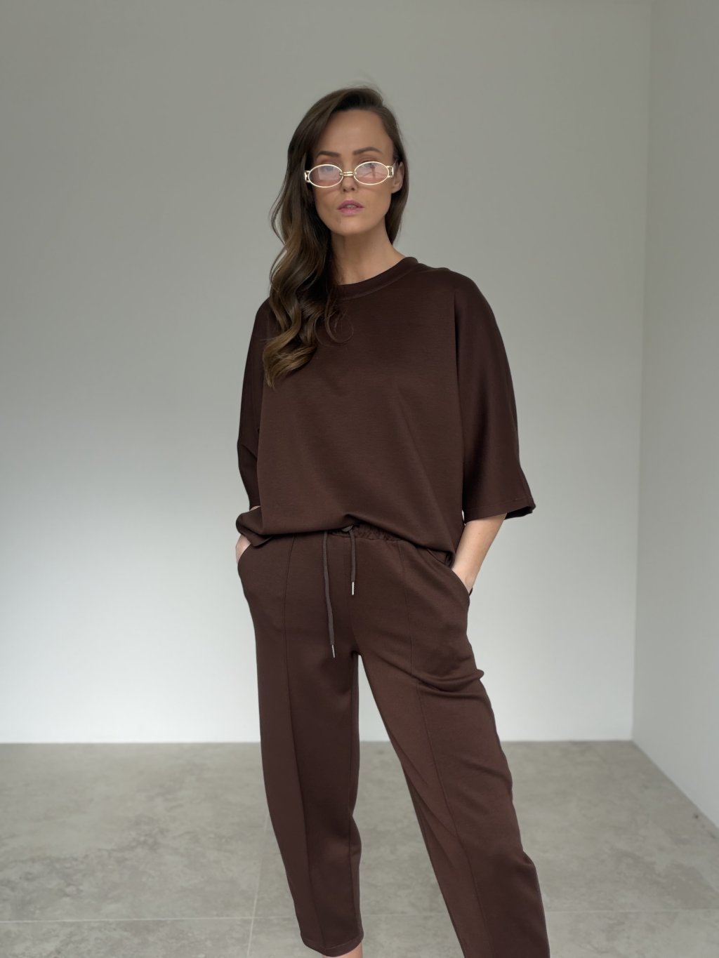 Pohodlný dvojdielny komplet z príjemného úpletu je ideálny na dni, keď chceš vyzerať upravene a zároveň sa cítiť maximálne komfortne. Voľnejší top s okrúhlym výstrihom a spadnutým ramenom pôsobí moderne a ležérne, krásne splýva a neobmedzuje v pohybe. Nohavice majú elastický pás so sťahovaním na šnúrku, praktické vrecká a uvoľnený strih, ktorý sedí prirodzene a pohodlne. Set sa dá nosiť spolu ako celok, ale rovnako dobre funguje aj po častiach v kombinácii s ďalšími kúskami z tvojho šatníka.