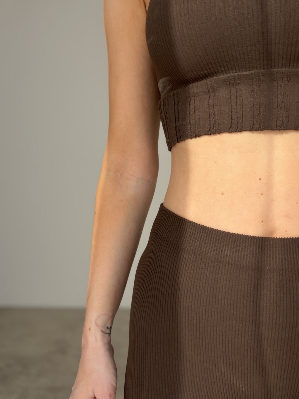 Pohodlný dvojdielny komplet z pružného rebrovaného úpletu: top bez rukávov a legíny s vysokým pásom. Ideálny na každodenné nosenie aj štýlové vrstvenie.