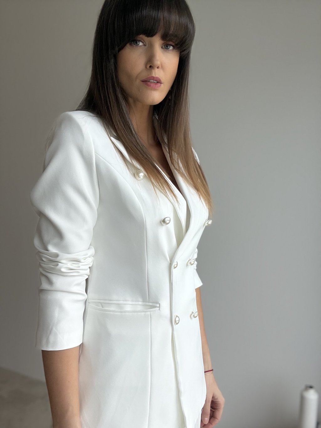 Elegantný dvojdielny komplet, ktorý spája predĺžené sako s výrazným zapínaním a jemne plisovanú midi sukňu. Sako má mierne vypasovaný strih, zvýrazňuje pás a vďaka dvojradovému zapínaniu s dekoratívnymi gombíkmi pôsobí veľmi reprezentatívne. Jemné prešívanie a čisté línie dodávajú celku luxusný charakter, ktorý sa hodí na oslavy, formálne stretnutia aj výnimočné príležitosti. Plisovaná sukňa sa krásne vlní pri chôdzi, opticky zoštíhľuje postavu a vďaka pohodlnému pásu sa príjemne nosí počas celého dňa. Komplet môžeš nosiť spolu ako ucelený outfit alebo kombinovať jednotlivé kúsky zvlášť – sako k nohaviciam, sukňu k topu či blúzke.