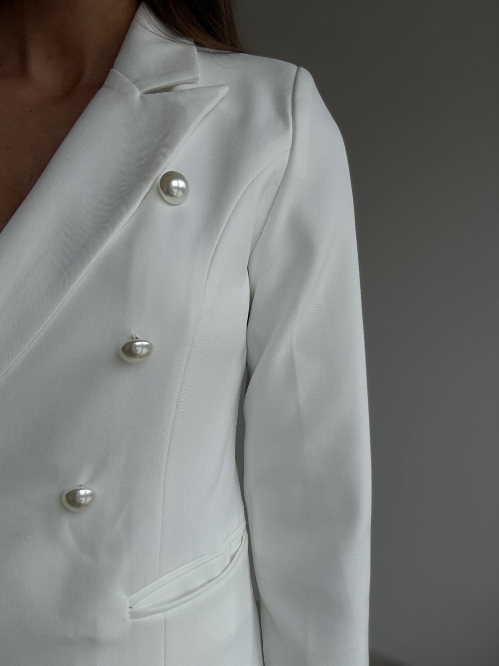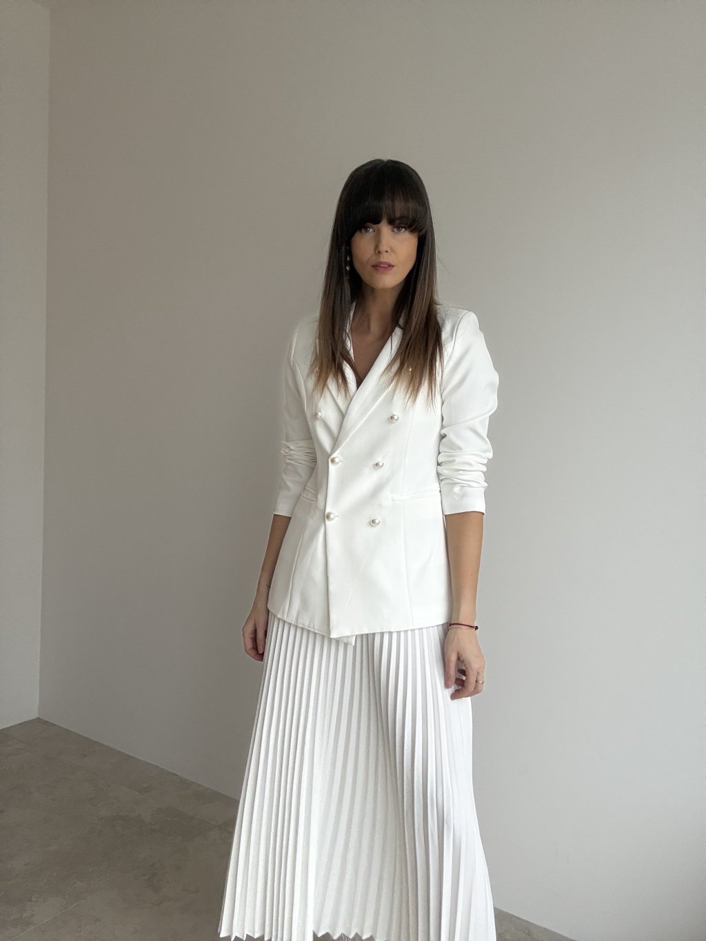 Dvojdielny komplet s predĺženým sakom s dvojradovým zapínaním a plisovanou midi sukňou. Reprezentatívny, ženský set vhodný na oslavy, formálne stretnutia aj výnimočné príležitosti.