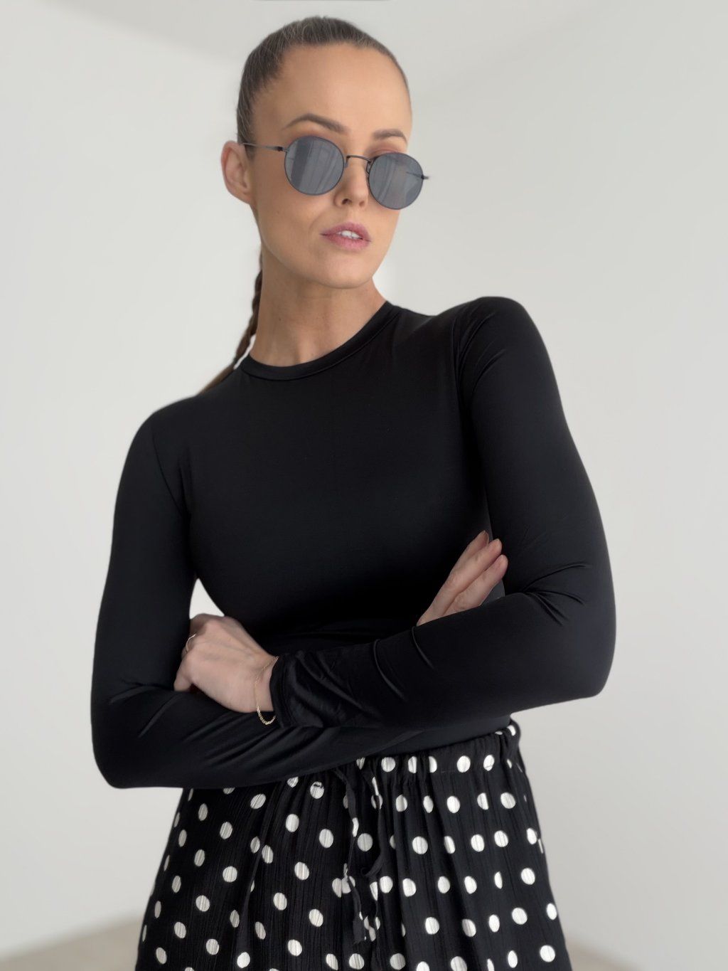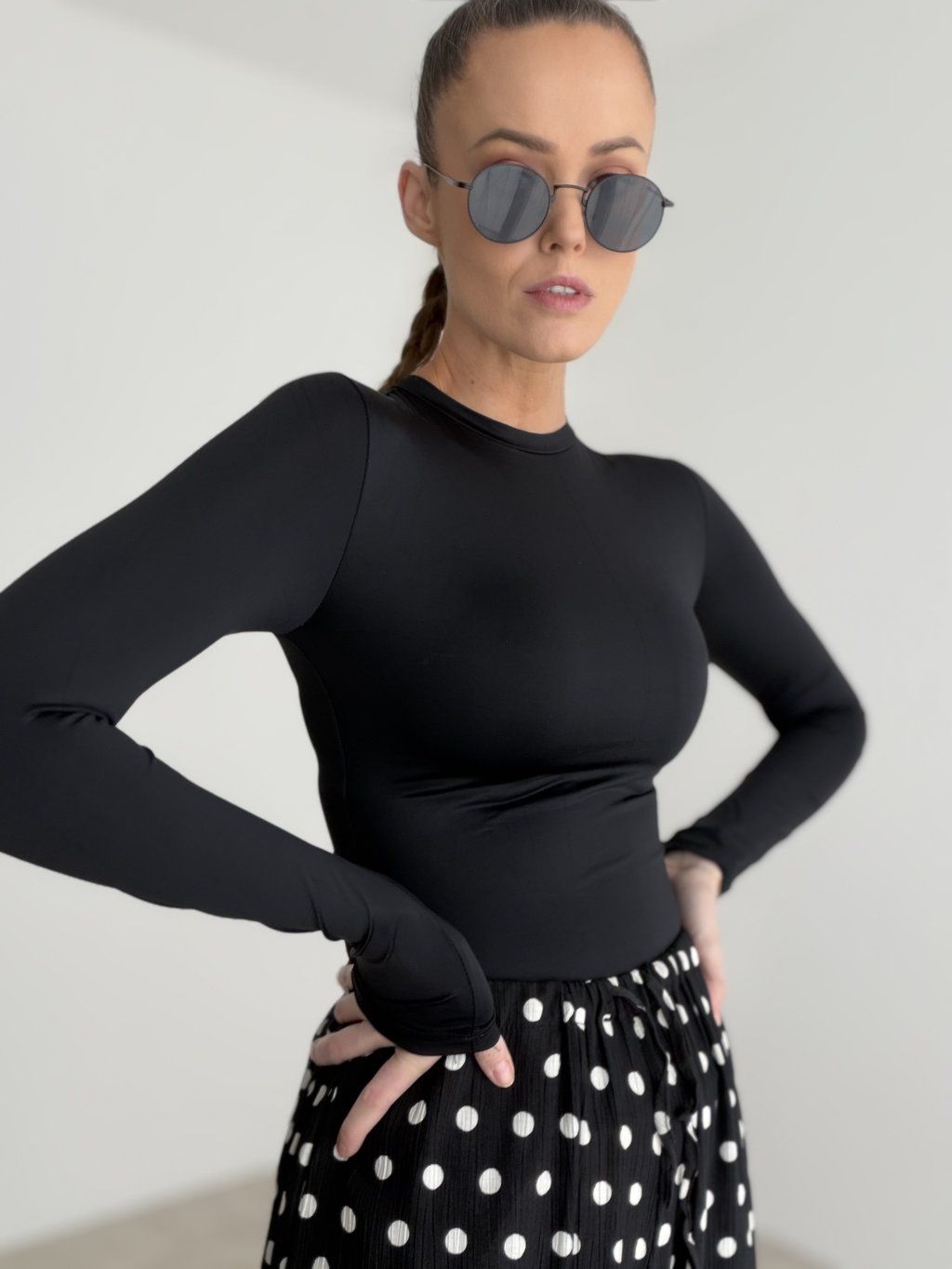 Priliehavý elastický nátelník s dlhými rukávmi a vyšším okrúhlym výstrihom. Hladký, pohodlný, vhodný aj na vrstvenie.