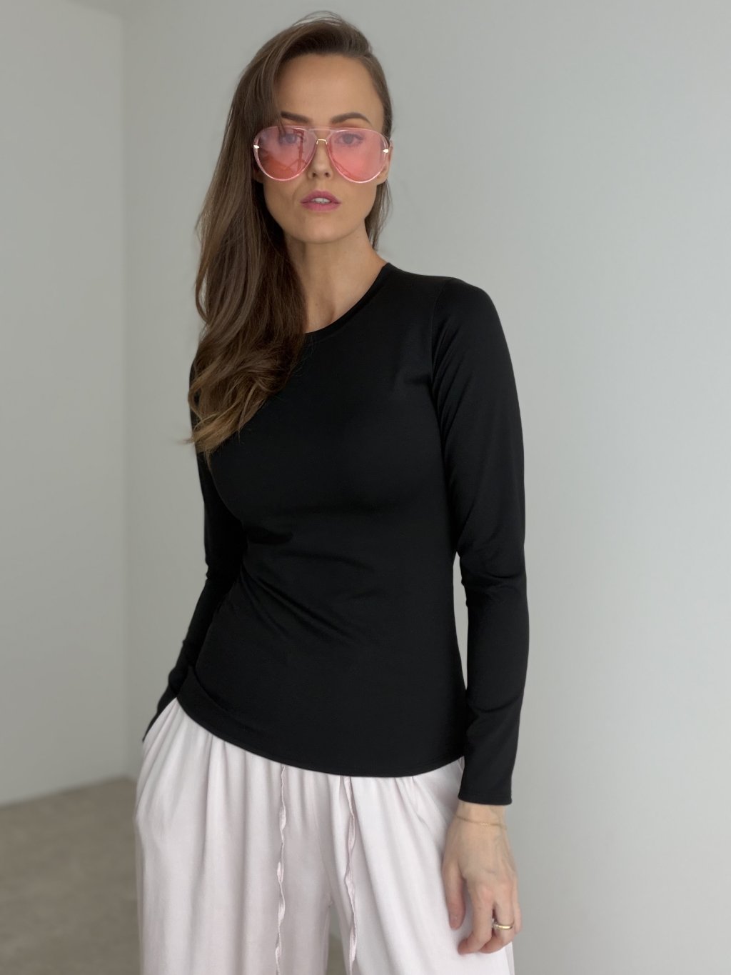Elastický top s dlhými rukávmi a hladkým povrchom sa prispôsobí postave a zvýrazní jej siluetu. Materiál je mäkký, pružný a zároveň priedušný, vďaka čomu poskytuje maximálne pohodlie počas celého dňa. Vhodný na nosenie samostatne aj ako základná vrstva pod sako, sveter či vestu.