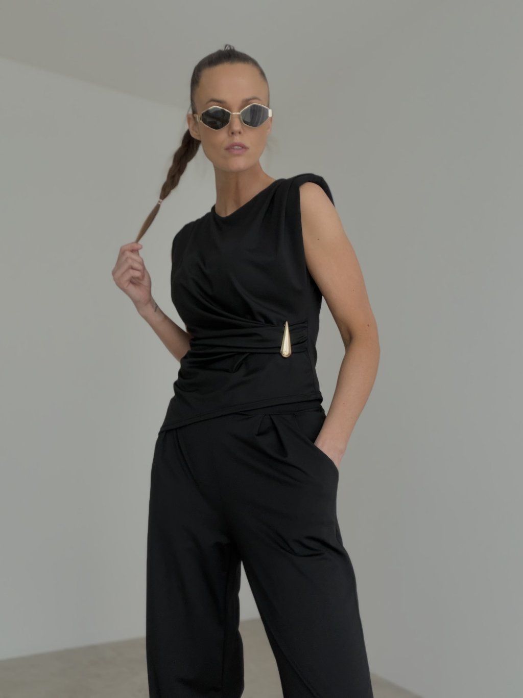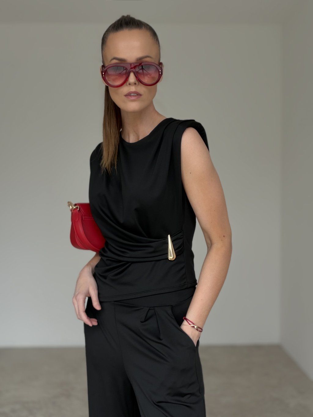 Elegantný komplet je ideálnou voľbou pre ženy, ktoré chcú pôsobiť sebavedomo, štýlovo a zároveň sa cítiť pohodlne. Vrchný diel bez rukávov zaujme moderným strihom a výrazným detailom v páse, ktorý krásne zvýrazní siluetu a dodáva outfitu sofistikovaný charakter. Nohavice s voľnejším strihom pôsobia vzdušne, splývavo a zabezpečujú komfort pri nosení počas celého dňa aj večera. Celý komplet vytvára harmonický a elegantný look, ktorý je vhodný na spoločenské príležitosti, večerné stretnutia aj štýlové nosenie počas dňa.