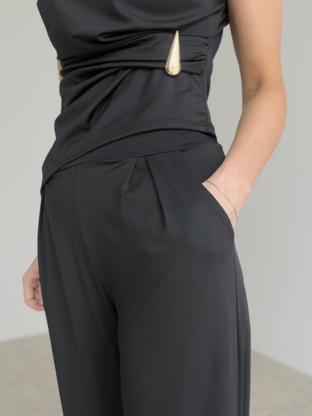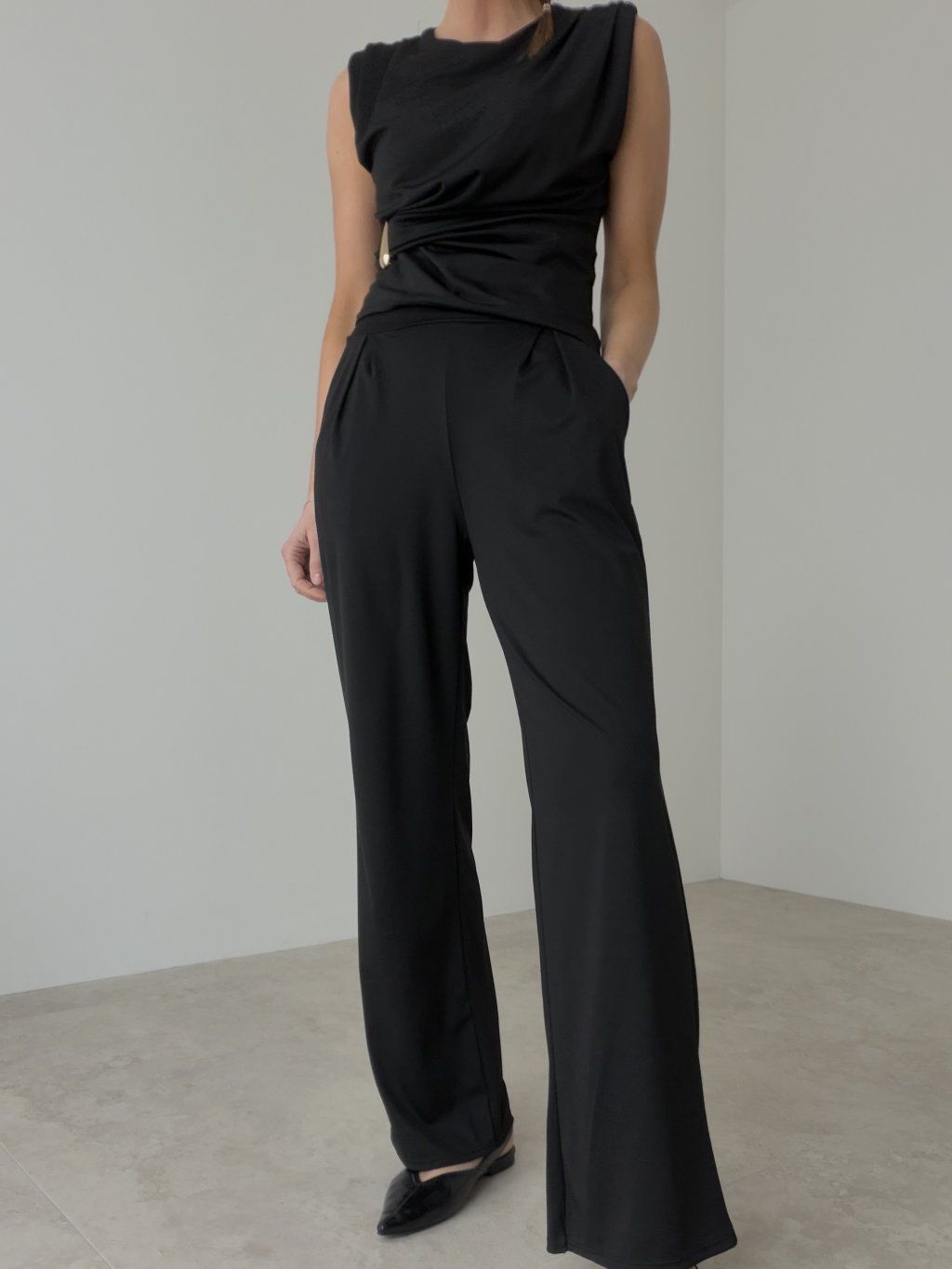 Štýlový elegantný komplet bez rukávov s výrazným detailom v páse a voľnejšími nohavicami. Nadčasový outfit, ktorý spája ženskosť, pohodlie a sofistikovaný vzhľad.