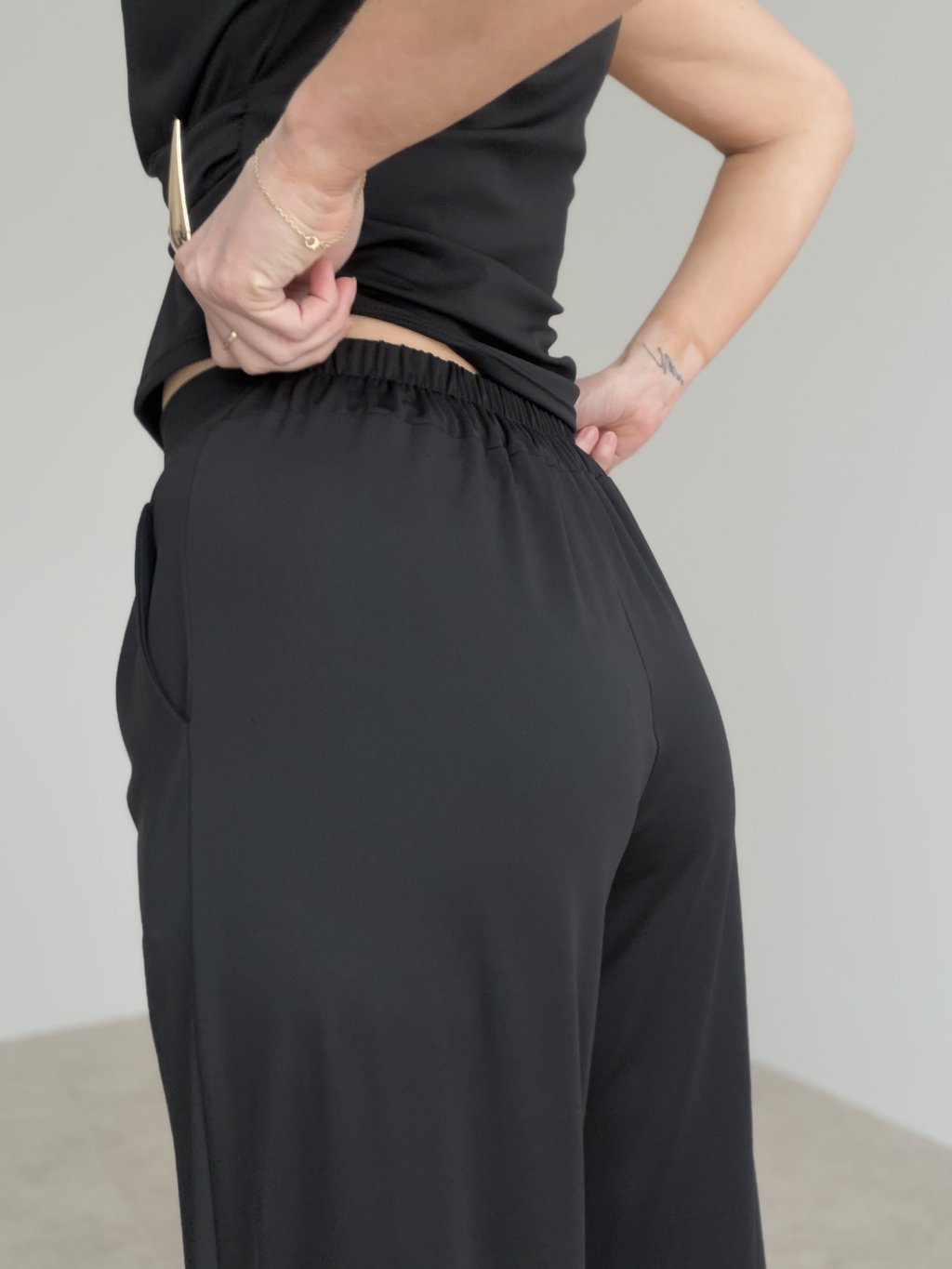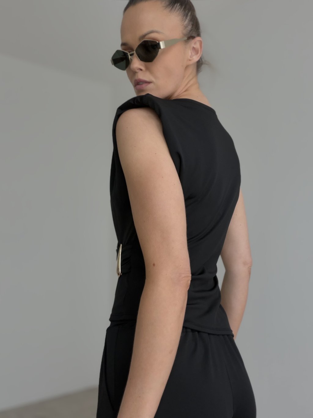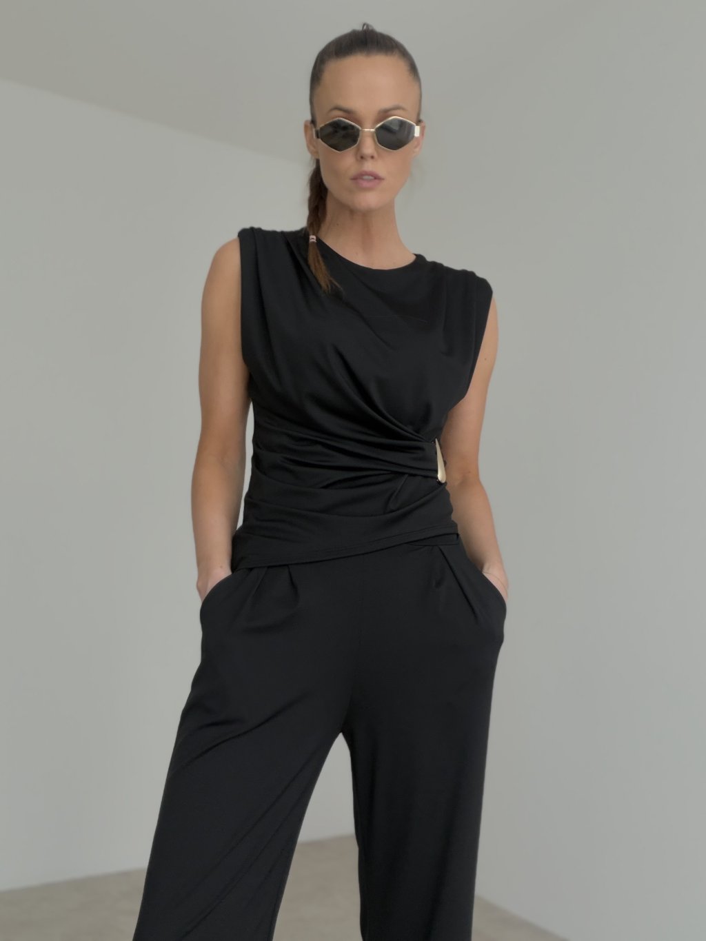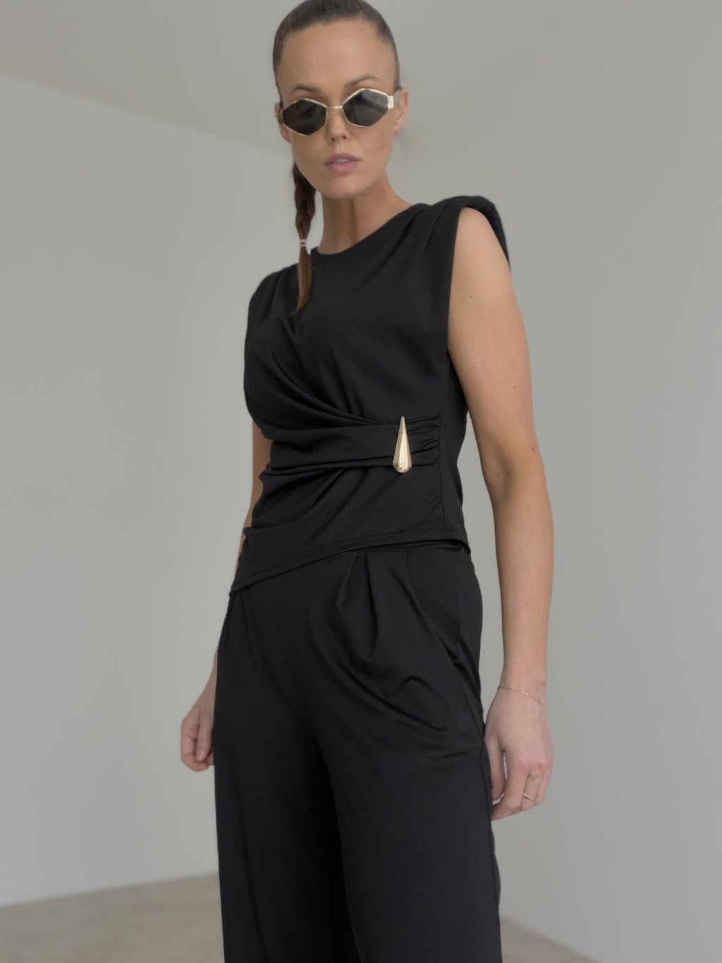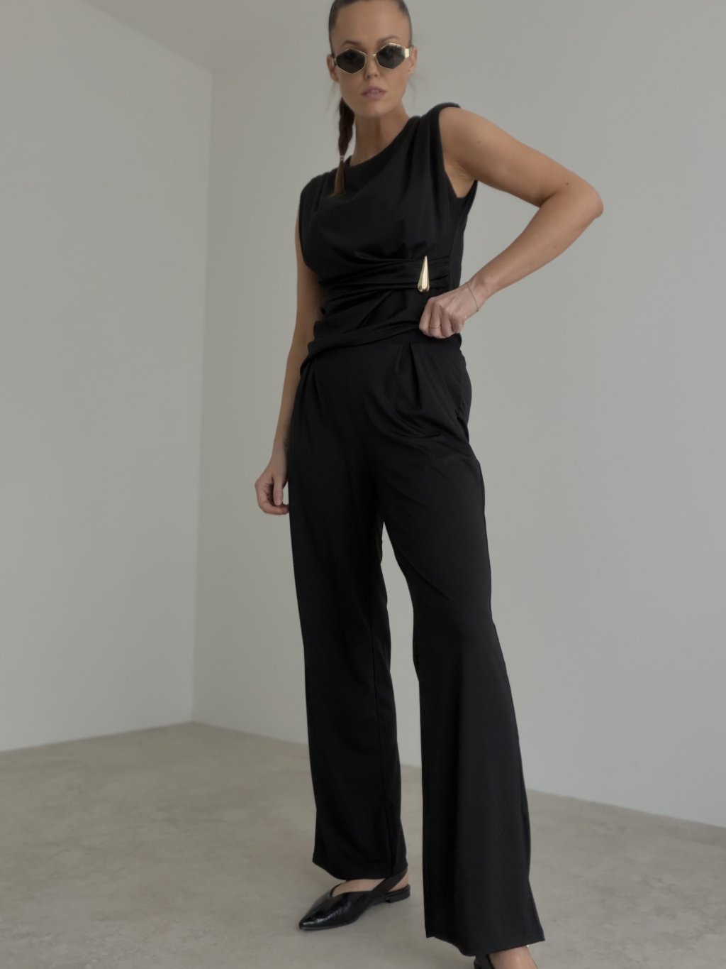 Štýlový elegantný komplet bez rukávov s výrazným detailom v páse a voľnejšími nohavicami. Nadčasový outfit, ktorý spája ženskosť, pohodlie a sofistikovaný vzhľad.