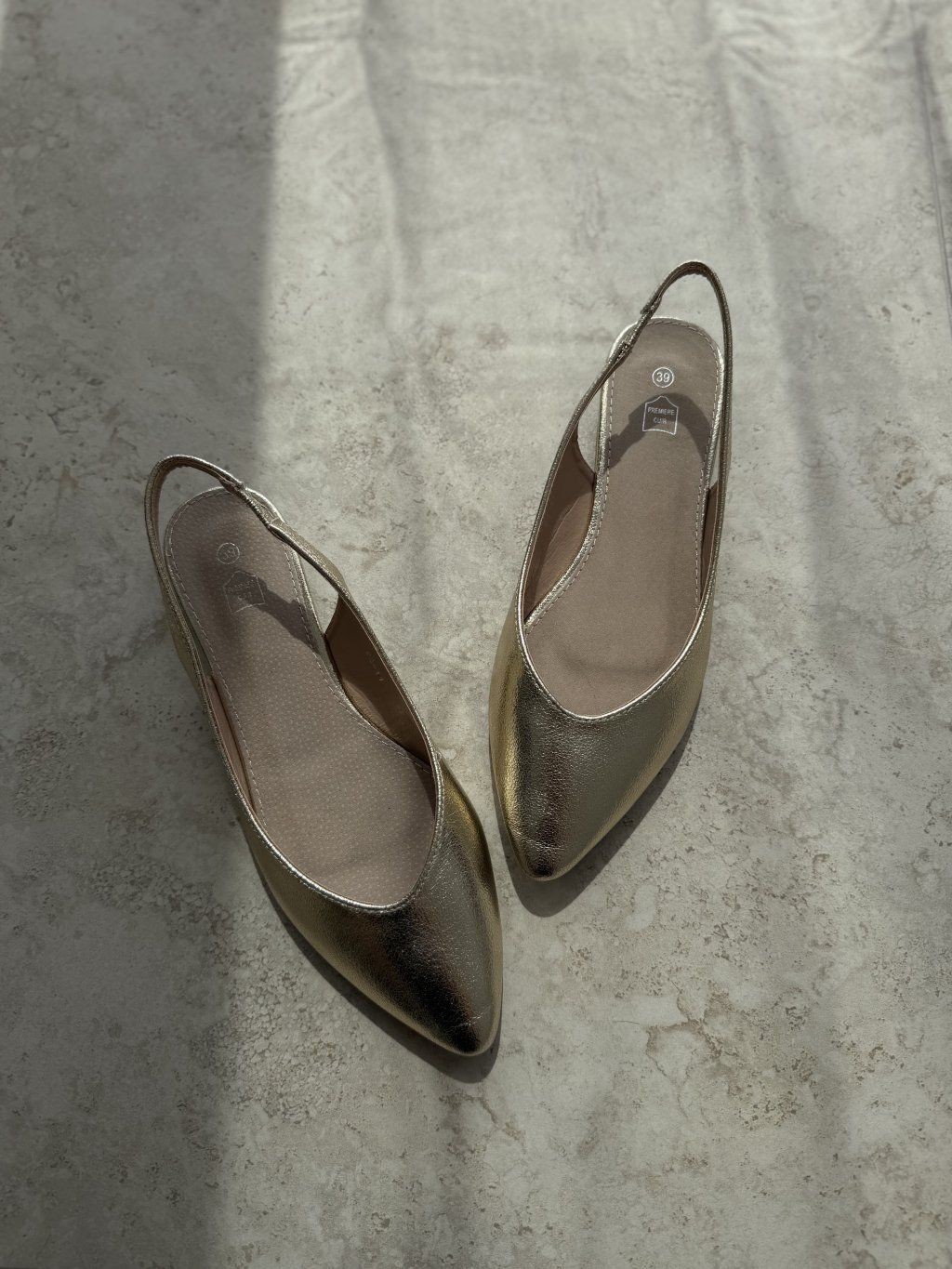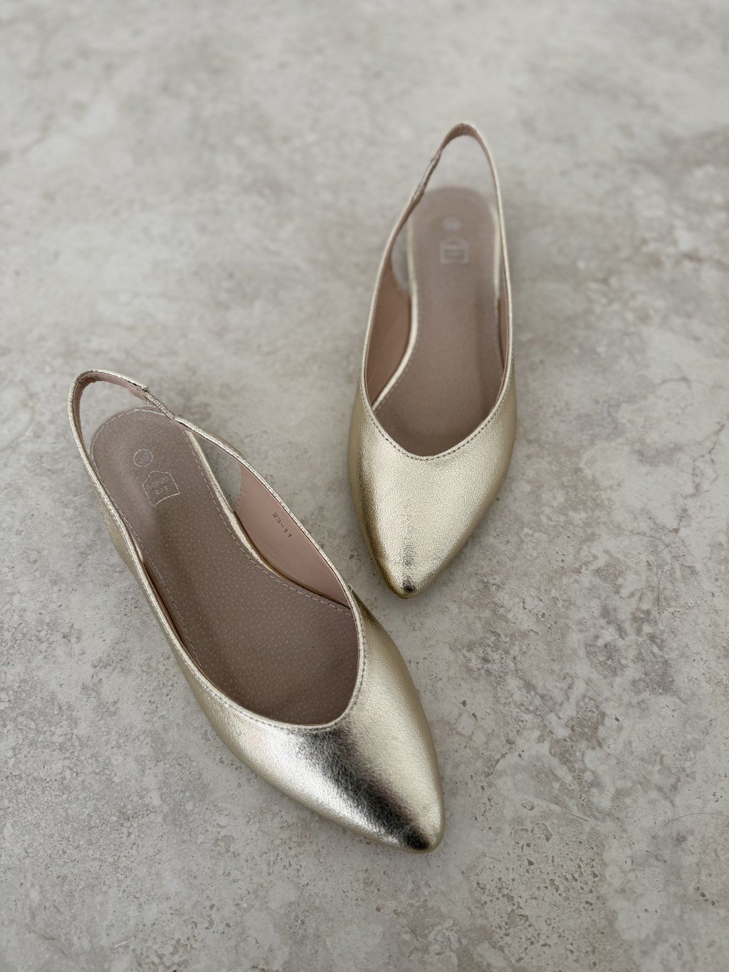 Elegant open-heel ballet flats with a pointed toe and low heel. A stylish and comfortable piece for dresses, skirts and trousers.