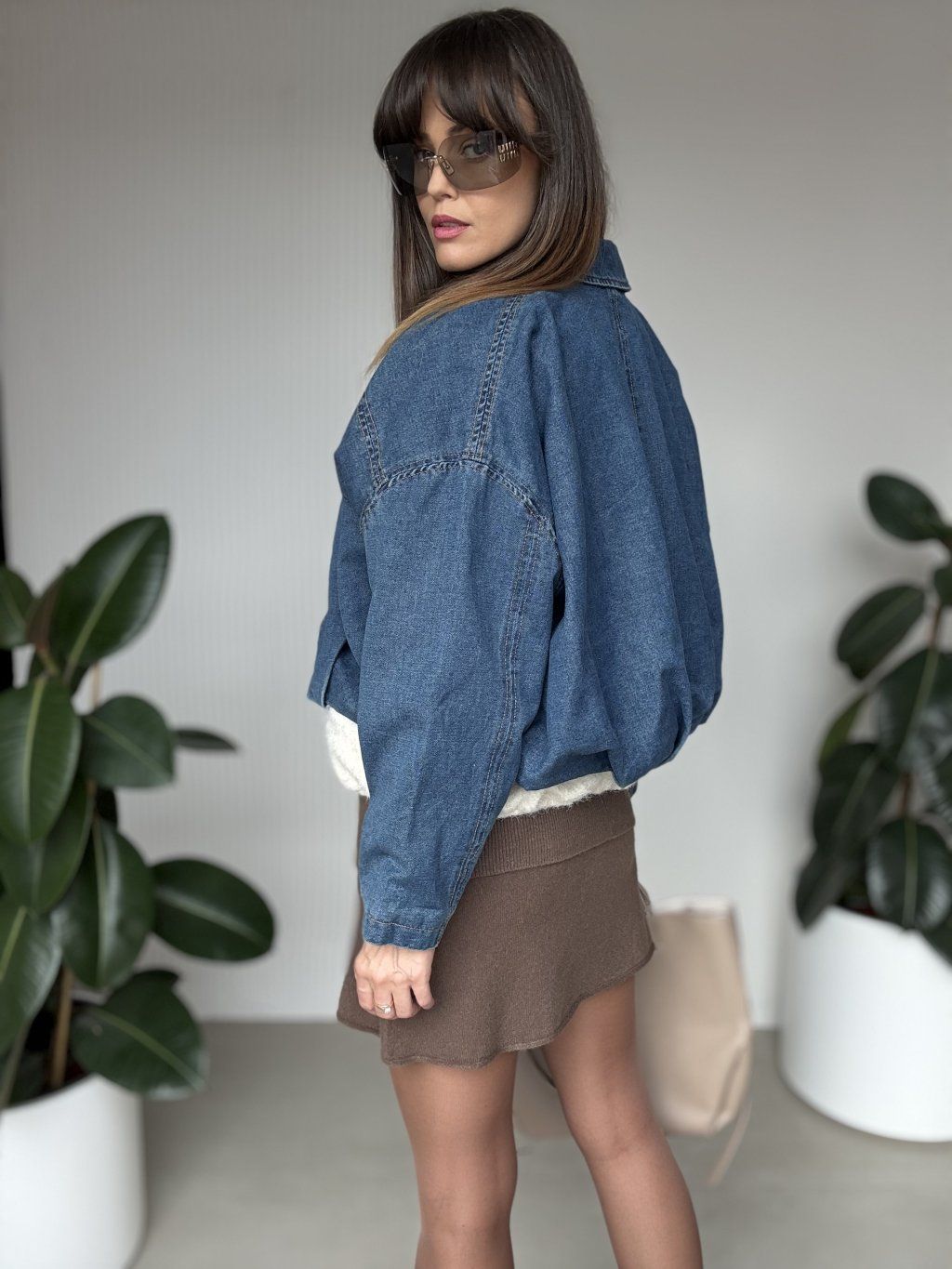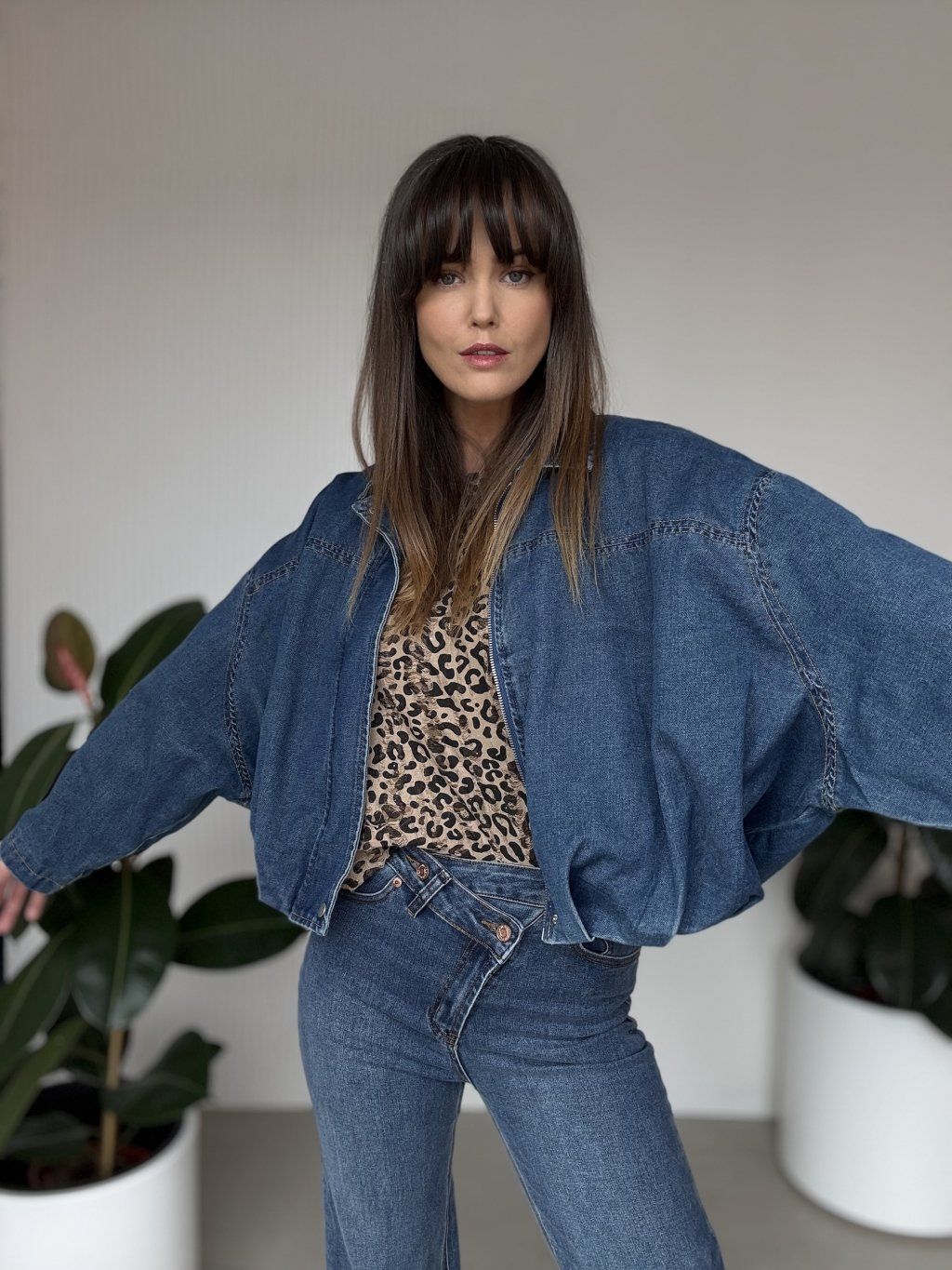 This balloon denim jacket with a relaxed fit is a trendy piece that stands out in any outfit. Its voluminous design adds a modern touch while ensuring comfort. Featuring a classic collar and front fastening, it has a timeless appeal that pairs perfectly with jeans, trousers, or dresses. Ideal for transitional weather or as a fashionable city look.