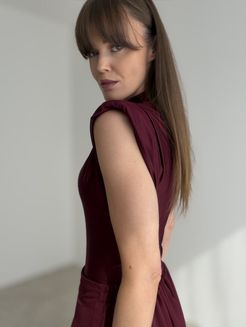 This bodysuit with structured shoulder pads offers a modern and elegant silhouette. The smooth, subtly shiny fabric fits the body beautifully, creating a clean and sophisticated look. The high neckline and soft draping add refined structure while maintaining comfort and ease of movement.