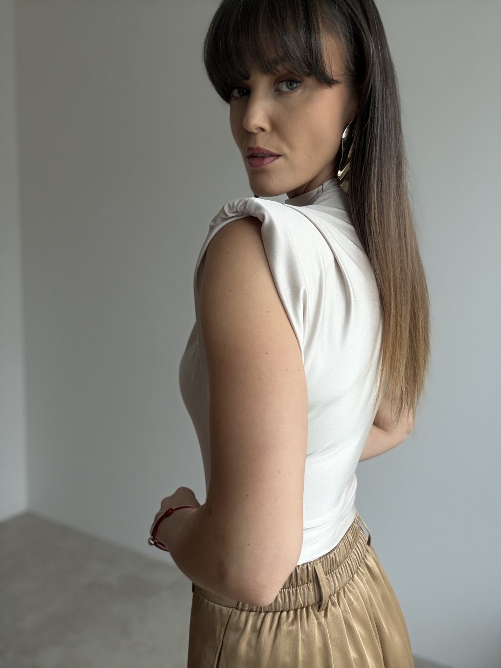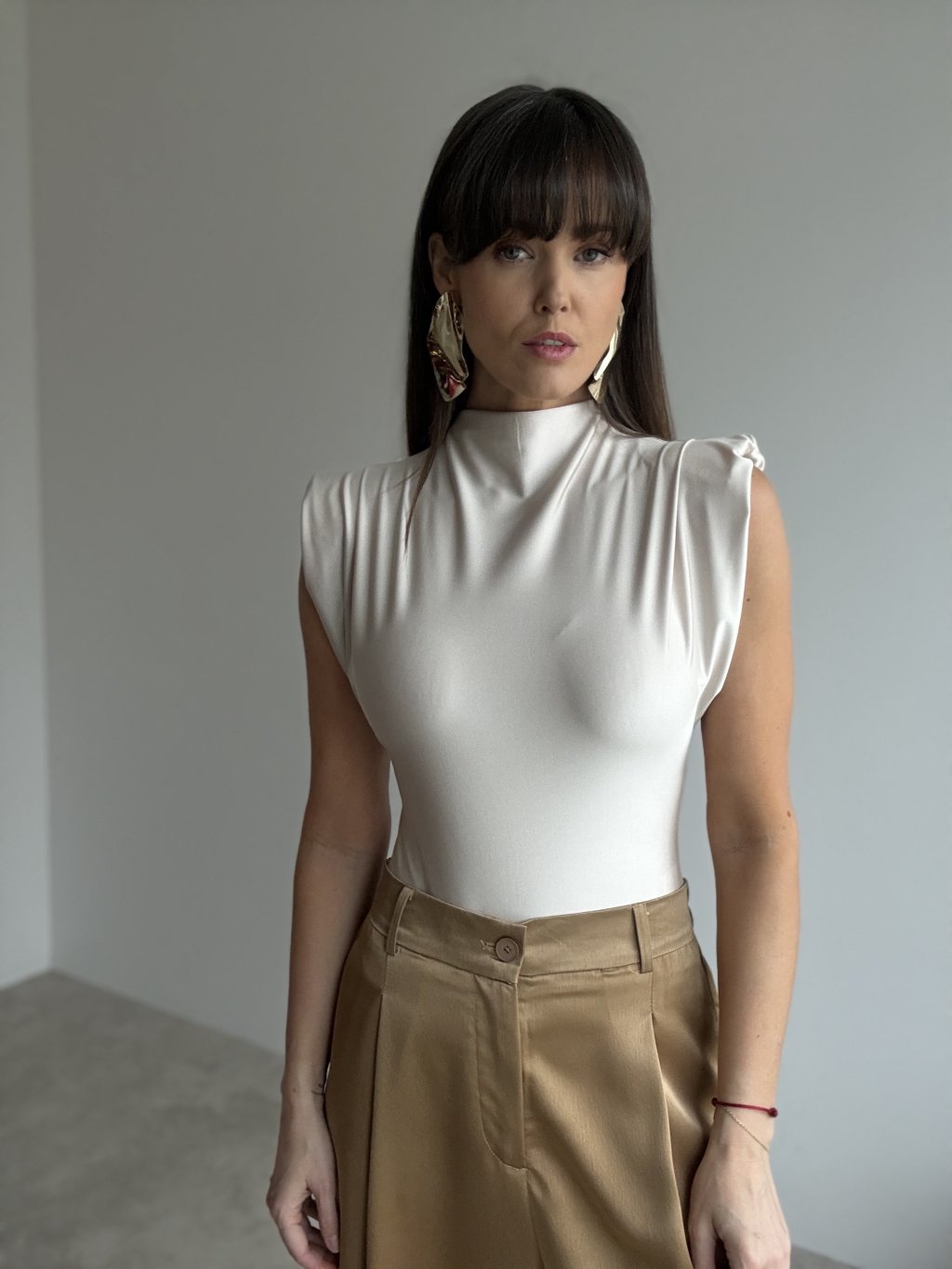 This bodysuit with structured shoulder pads offers a modern and elegant silhouette. The smooth, subtly shiny fabric fits the body beautifully, creating a clean and sophisticated look. The high neckline and soft draping add refined structure while maintaining comfort and ease of movement.