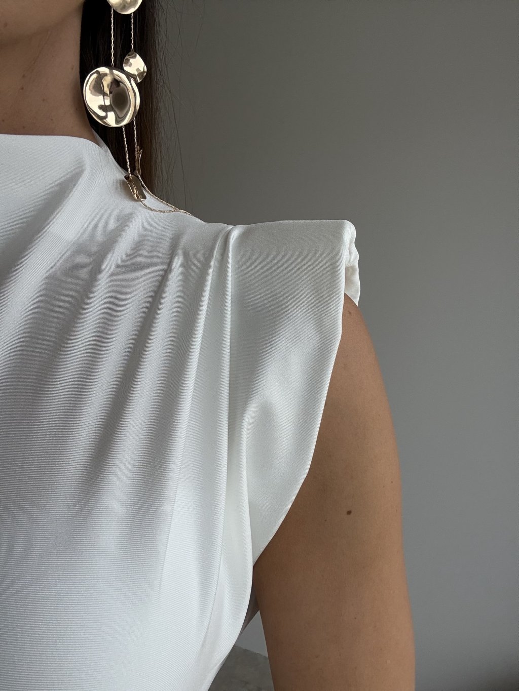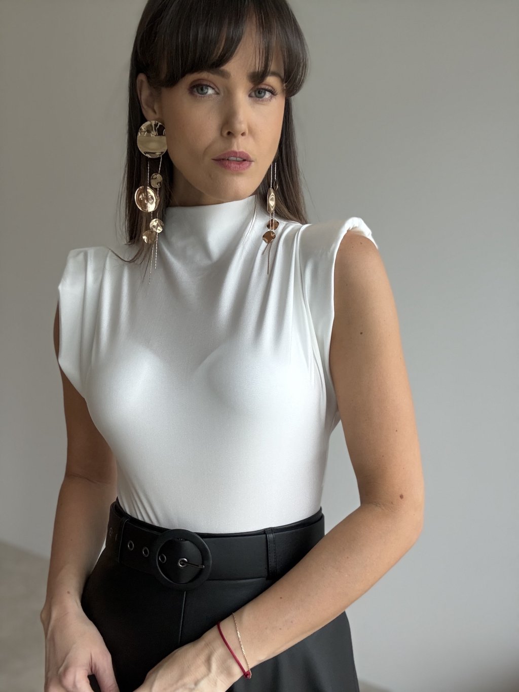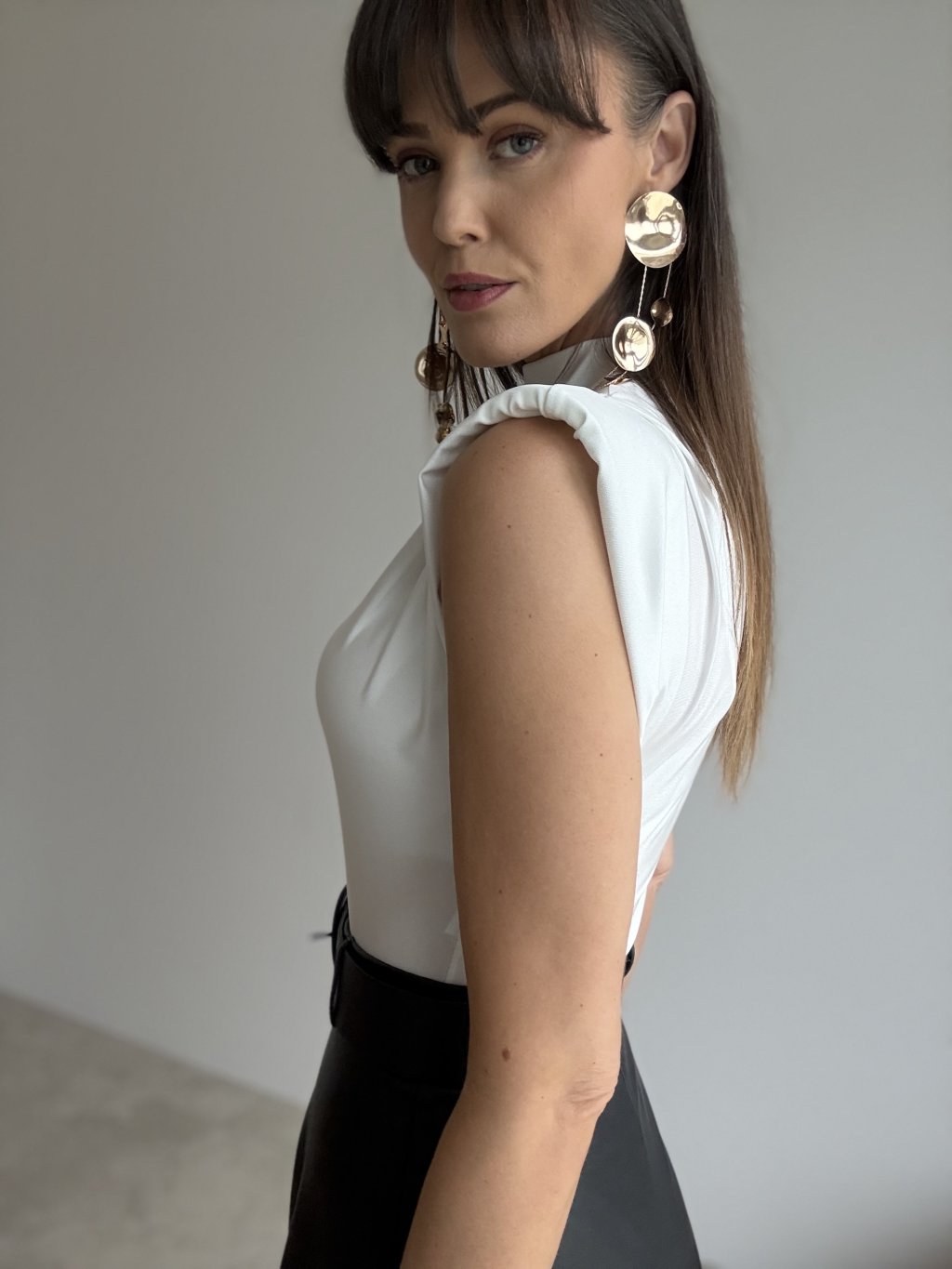 This bodysuit with structured shoulder pads offers a modern and elegant silhouette. The smooth, subtly shiny fabric fits the body beautifully, creating a clean and sophisticated look. The high neckline and soft draping add refined structure while maintaining comfort and ease of movement.
