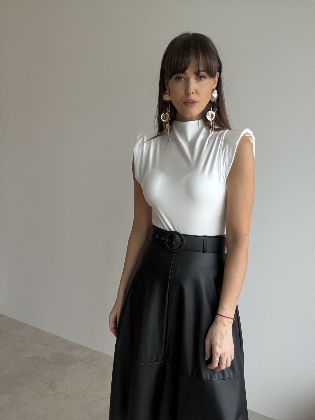 A perfect piece to combine with high-waisted skirts, tailored trousers or evening outfits. The bodysuit keeps its shape, does not wrinkle easily, and looks polished throughout the day.