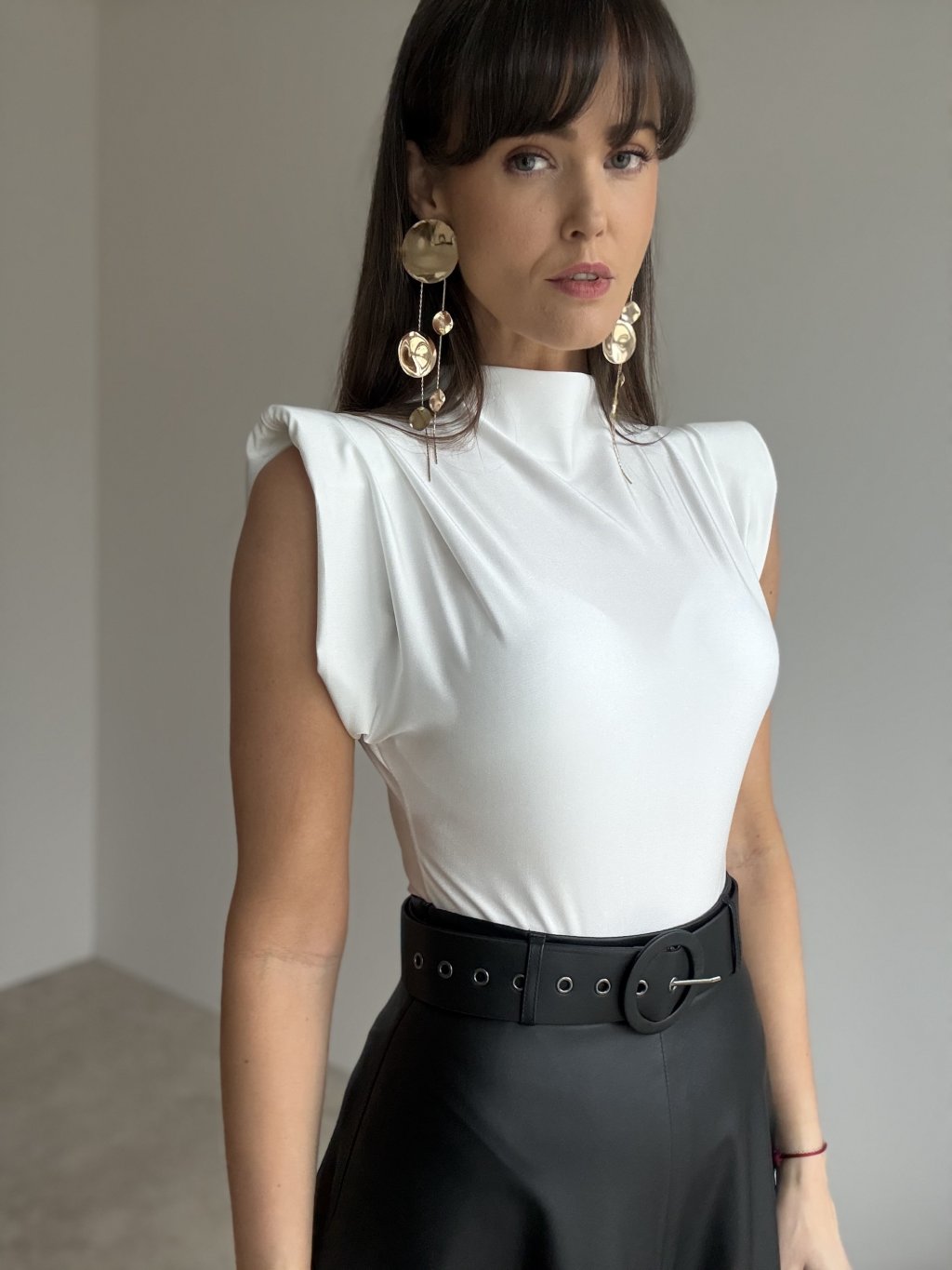 Elegant bodysuit with shoulder pads, a high neckline and a smooth, slightly shiny finish.