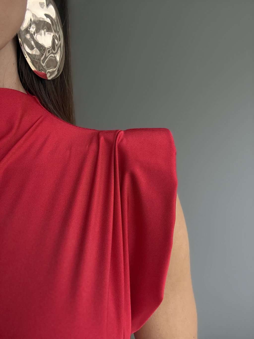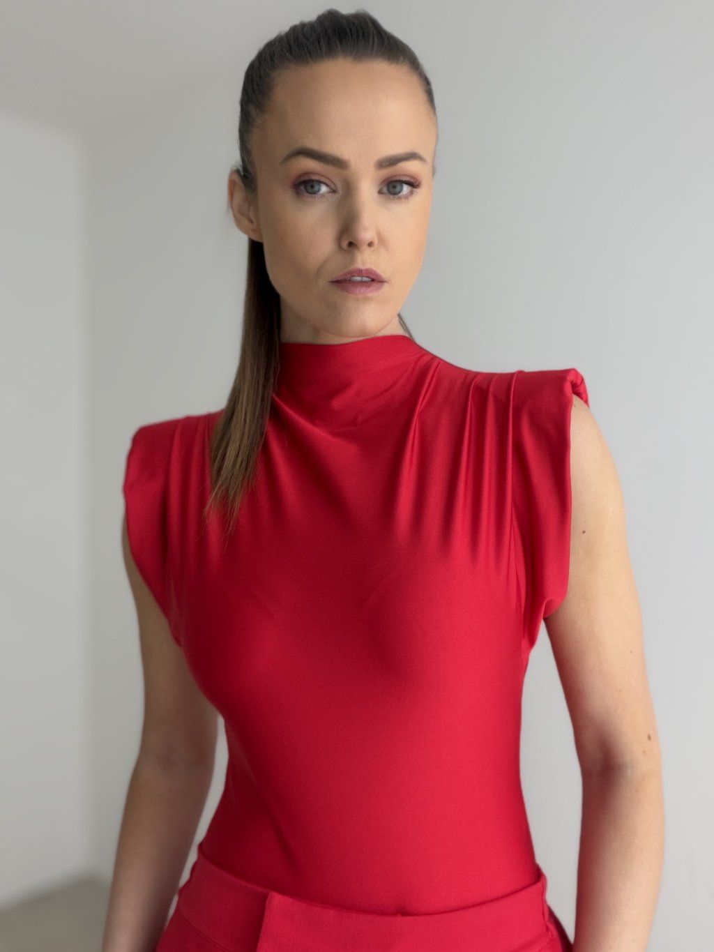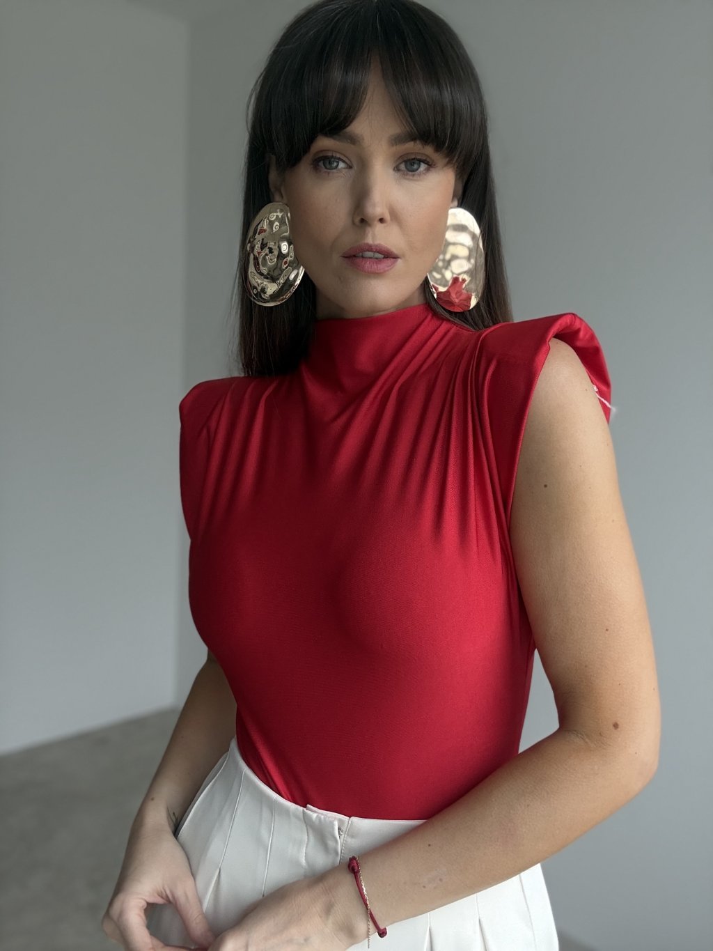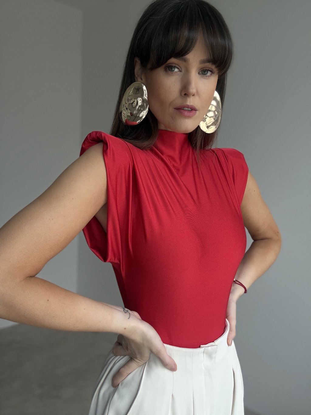 This bodysuit with structured shoulder pads offers a modern and elegant silhouette. The smooth, subtly shiny fabric fits the body beautifully, creating a clean and sophisticated look. The high neckline and soft draping add refined structure while maintaining comfort and ease of movement.