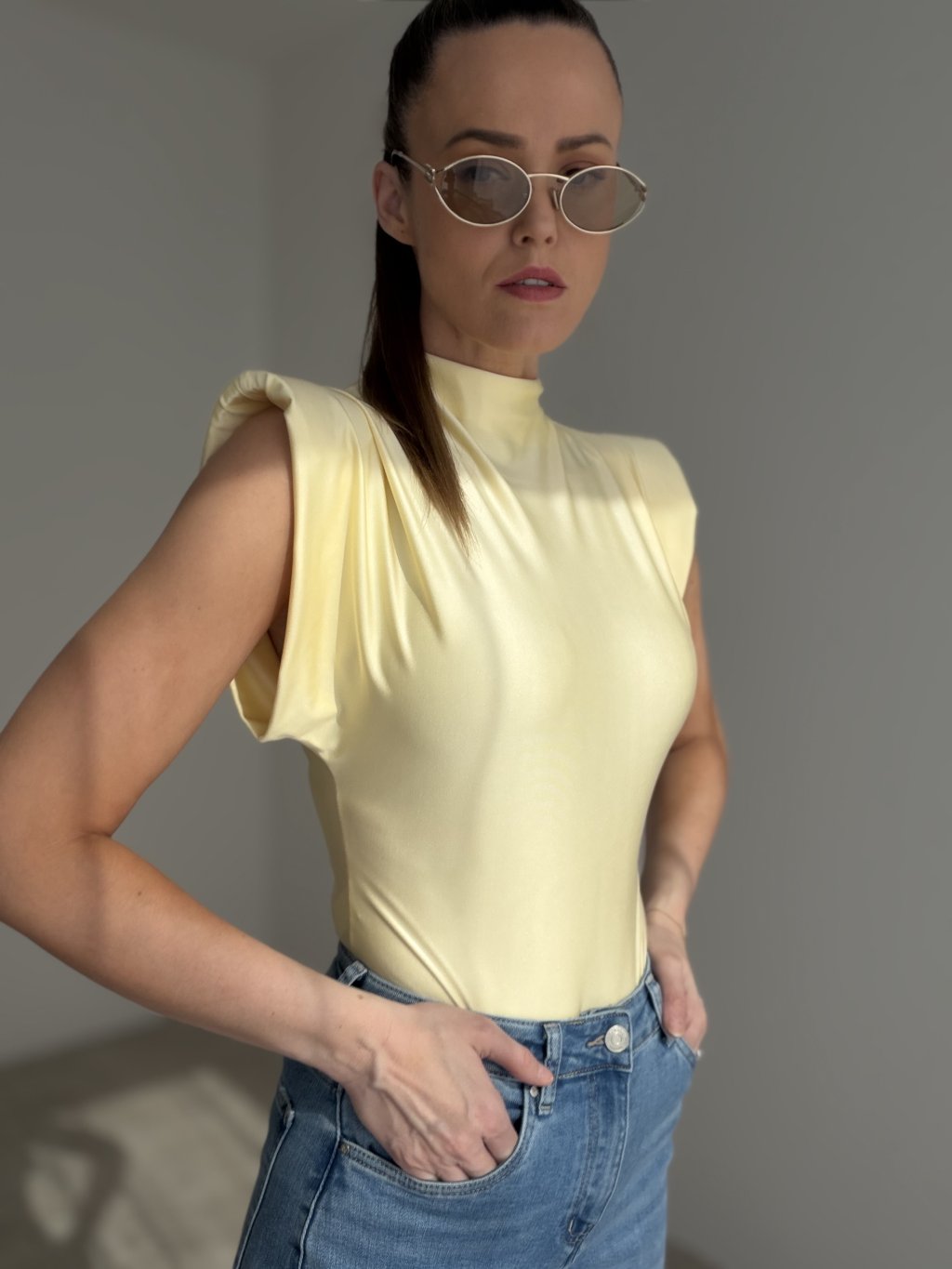 This bodysuit with structured shoulder pads offers a modern and elegant silhouette. The smooth, subtly shiny fabric fits the body beautifully, creating a clean and sophisticated look. The high neckline and soft draping add refined structure while maintaining comfort and ease of movement.