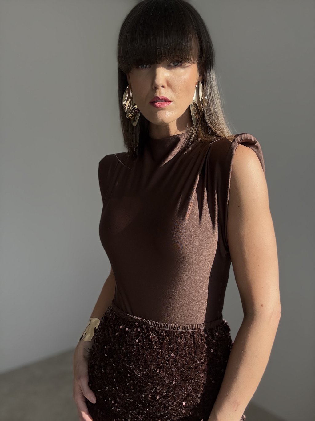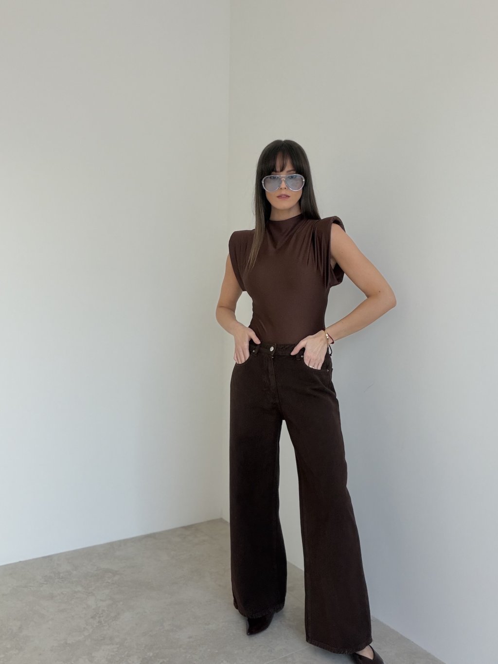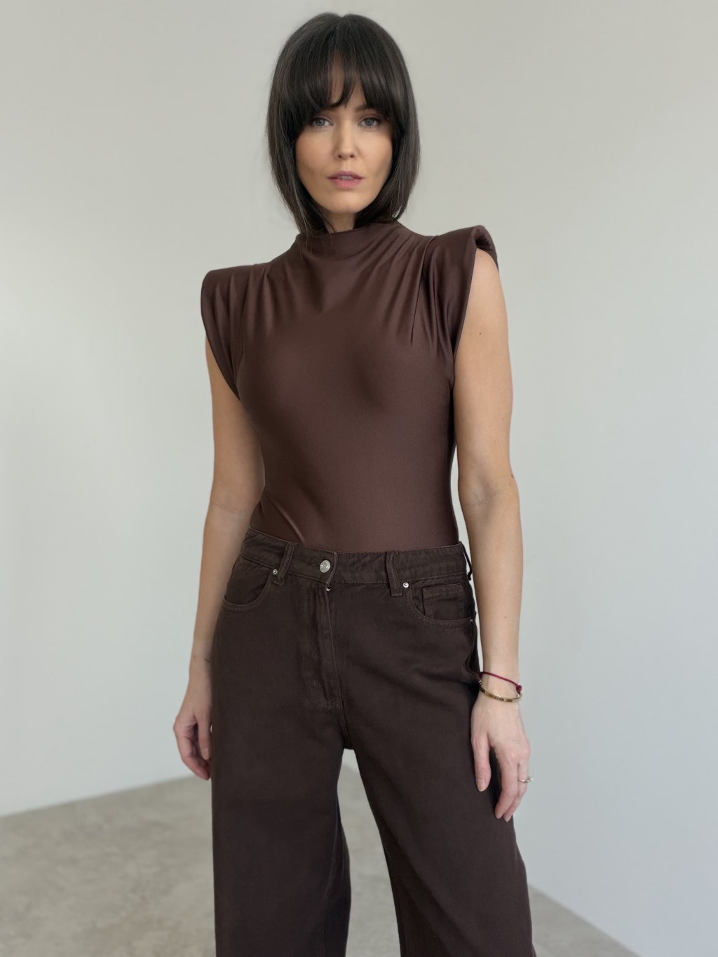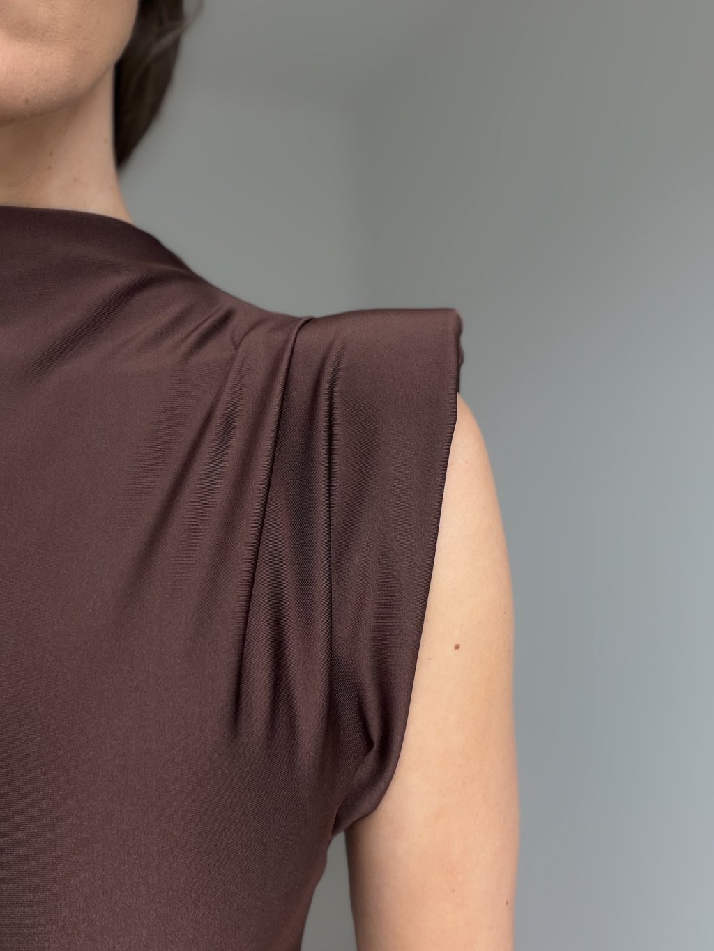 This bodysuit with structured shoulder pads offers a modern and elegant silhouette. The smooth, subtly shiny fabric fits the body beautifully, creating a clean and sophisticated look. The high neckline and soft draping add refined structure while maintaining comfort and ease of movement.